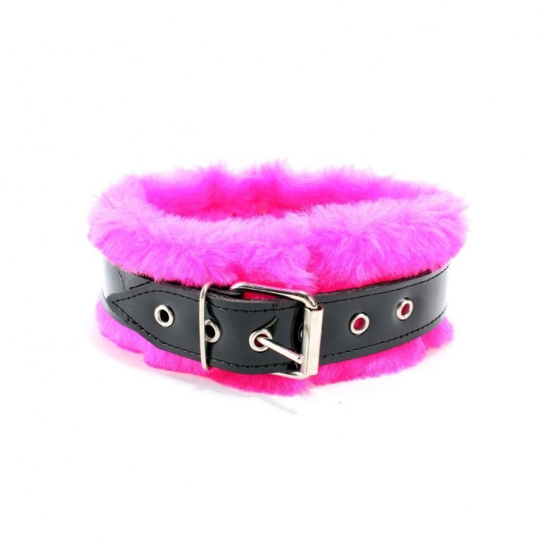 Ошейник выполнен из натуральной лакированной кожи черного цвета. Подклад сделан из розового меха. Ремень позволяет выбрать нужный размер, подойдет на обхват от 28 до 37 см. Металлическая пряжка надежно фиксирует аксессуар, мех обеспечивает комфорт. Декорирован металлическим полукольцом по центру, к которому пристегивается поводок. Нежный и страстный аксессуар станет отличным дополнение к Вашей БДСМ игре. Ширина - 6 см. Длина поводка - 55 см.