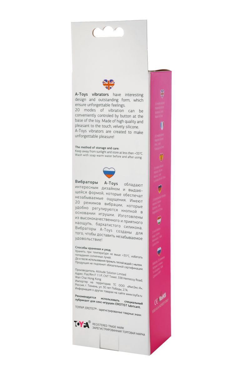 Вибраторы A-Toys — обладают интересным дизайном и выдающейся формой, которые обеспечат незабываемые ощущения. Имеют 20 режимов вибрации, которые удобно регулируются кнопкой в основании игрушки. Изготовлены из высококачественного и приятного на ощупь, бархатистого силикона.Вибраторы A-Toys созданы для того, чтобы доставить незабываемое удовольствие! Рабочая длина - 13 см.