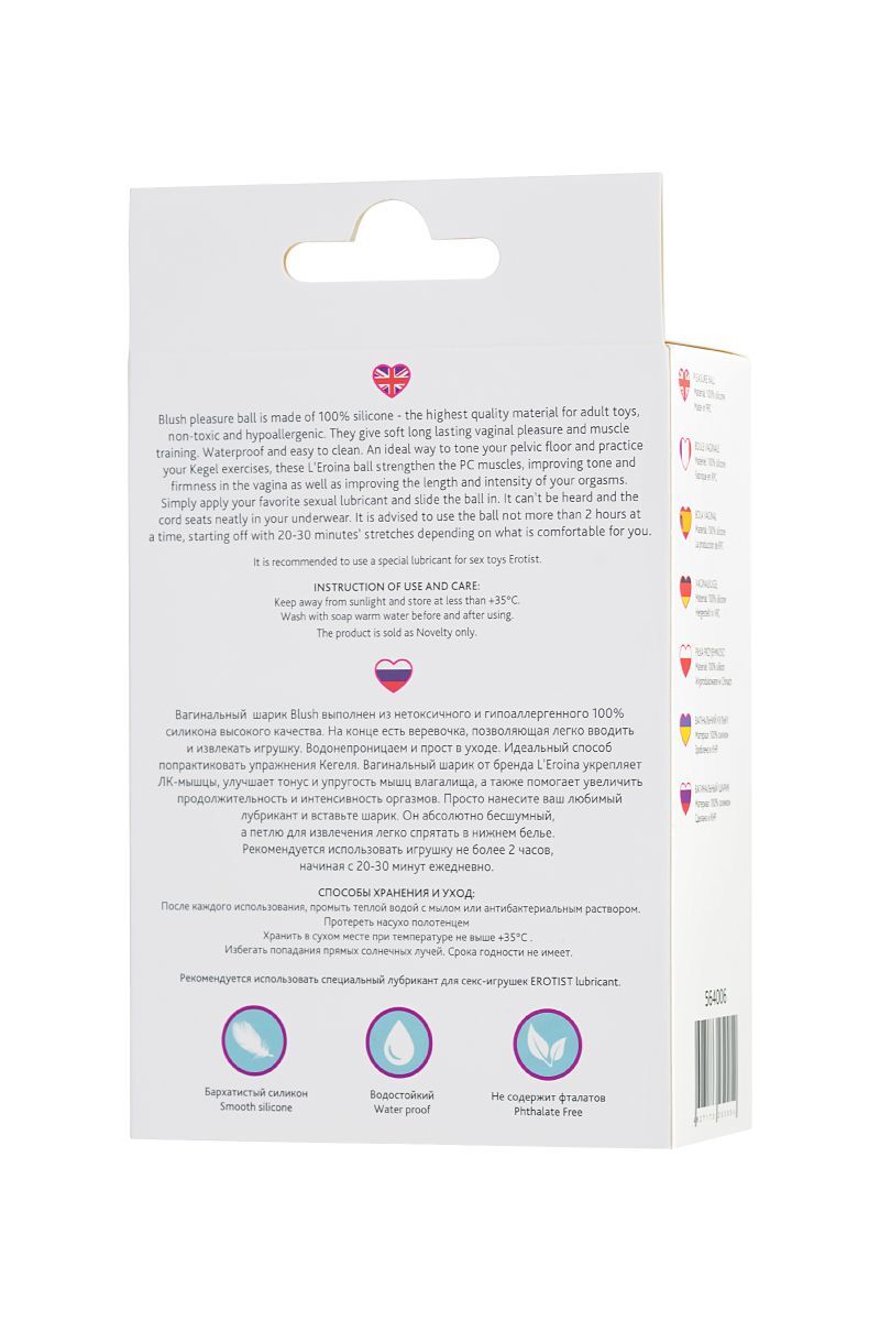 Вагинальный шарик Blush выполнен из нетоксичного и гипоаллергенного 100% силикона высокого качества. На конце есть веревочка, позволяющая легко вводить и извлекать игрушку. Водонепроницаем и прост в уходе. Идеальный способ попрактиковать упражнения Кегеля. Вагинальный шарик от бренда L’Eroina укрепляет ЛК-мышцы, улучшает тонус и упругость мышц влагалища, а также помогает увеличить продолжительность и интенсивность оргазмов. Просто нанесите ваш любимый лубрикант и вставьте шарик. Он абсолютно бесшумный, а петлю для извлечения легко спрятать в нижнем белье. Вес - 65 гр.