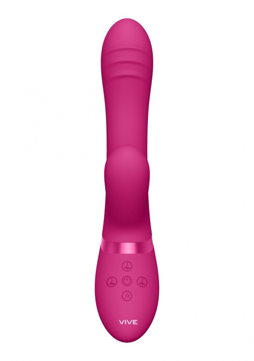 Tani – это один из немногих вибраторов, оснащенных функцией имитации движения пальцев для двойной стимуляции точки G/P. Оснащен 3 мощными независимыми моторами: вибрационный в головке, импульсно-волновой в клиторальном отростке и Finger Motion мотор. Изготовлено изделие из шелковистого медицинского (гипоаллергенного) силикона и как большинство моделей линейки VIVE имеет кнопку мгновенного оргазма, запуская все моторы на максимум одним касанием. Такой вибратор можно брать с собой в ванную и душ. Рабочая длина - 11 см.