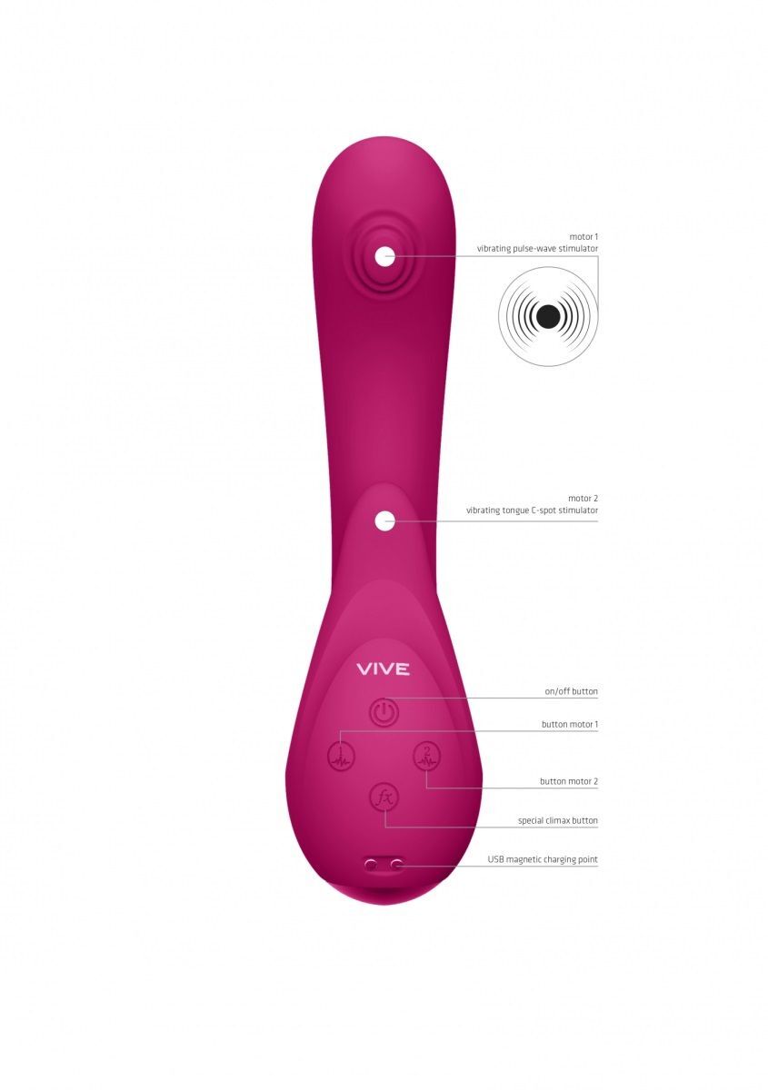 Miki – это милый и нежный, но мощный кролик, разработанный с учетом женской анатомии. Оснащен 3 мощными независимыми моторами: импульсно-волновой в головке для активной стимуляции точки G, вибрационный мотор клиторальном отростке и головке вибратора. Клиторальный отросток с функцией мерцающего язычка. Изготовлено изделие из шелковистого медицинского гипоаллергенного силикона и как большинство моделей линейки VIVE имеет кнопку мгновенного оргазма, запуская все моторы на максимум одним касанием. Такой вибратор можно брать с собой в ванную и душ. Рабочая длина - 12 см.