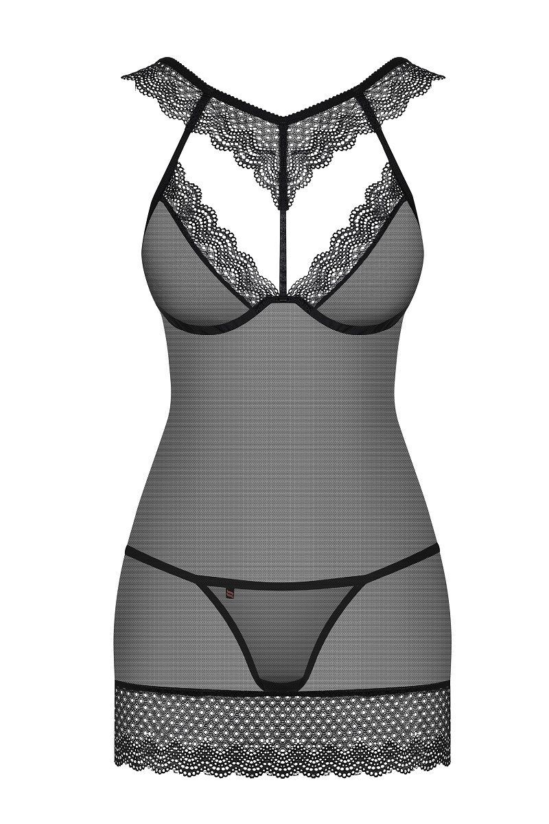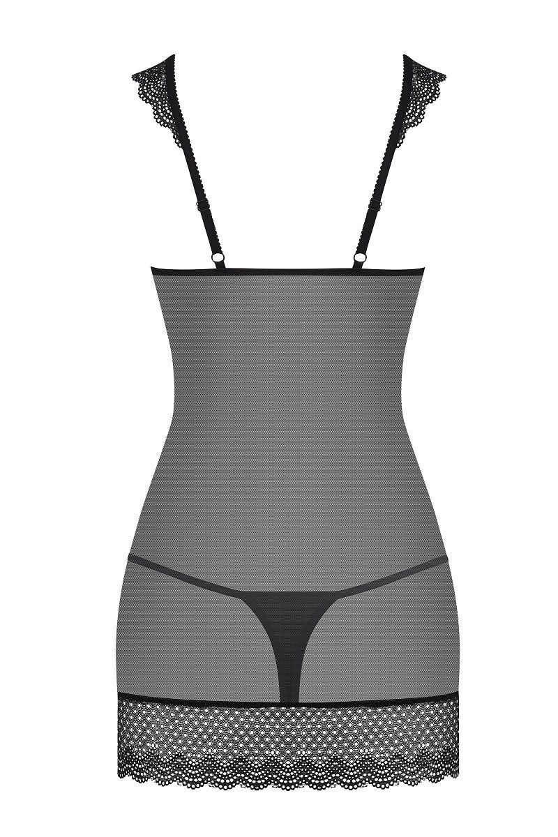 Сорочка выполнена из полупрозрачной сеточки в сочетании с отделкой из красивого кружева, бретели регулируются. В комплекте: сорочка, трусики-стринги.