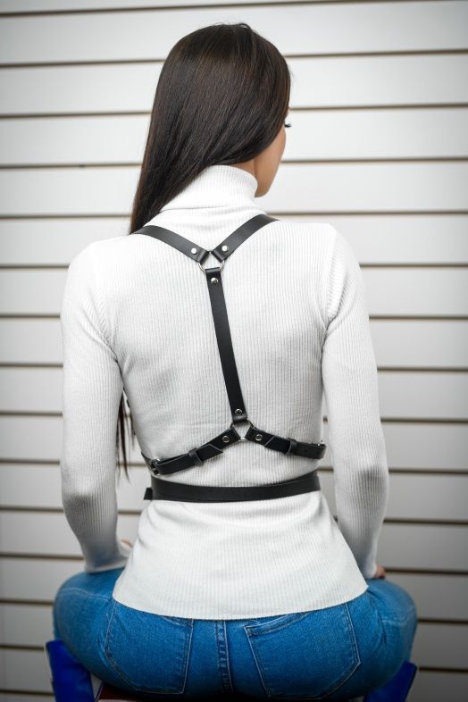 Сексуальная портупея из натуральной кожи черного цвета, декорирована металлическими кольцами. Два длинных ремешка крест-накрест застегиваются вокруг талии, добавляя любому вашему образу изюминку. Аксессуар можно носить, как кольцом вперед, так и кольцом назад, Размер удобно регулируется благодаря трём металлическим пряжкам. Расстояние от кольца до кольца - 23 см. Максимальный обхват в талии - 85 см.