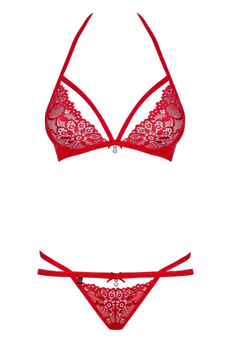 Кружевной комплект: бюстгальтер, мягкая треугольная чашка, бретели застегиваются вокруг шеи и застегиваются на спине. Трусики стринги. Бюстгальтер и трусики украшены атласным бантом и подвеской со стразами. В комплекте: бюстгальтер и трусики-стринги.