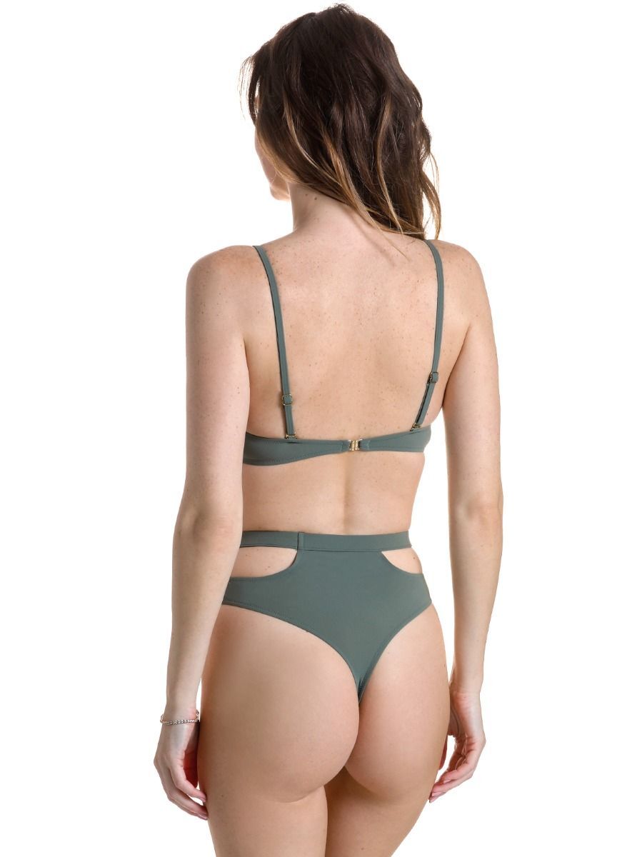 Купальник: бюстгальтер с мягкой чашкой и трусики стринги с высокой линией талии и фигурными вырезами по бокам. Бретели несъемные, регулируемые. В комплекте: лиф, трусики.