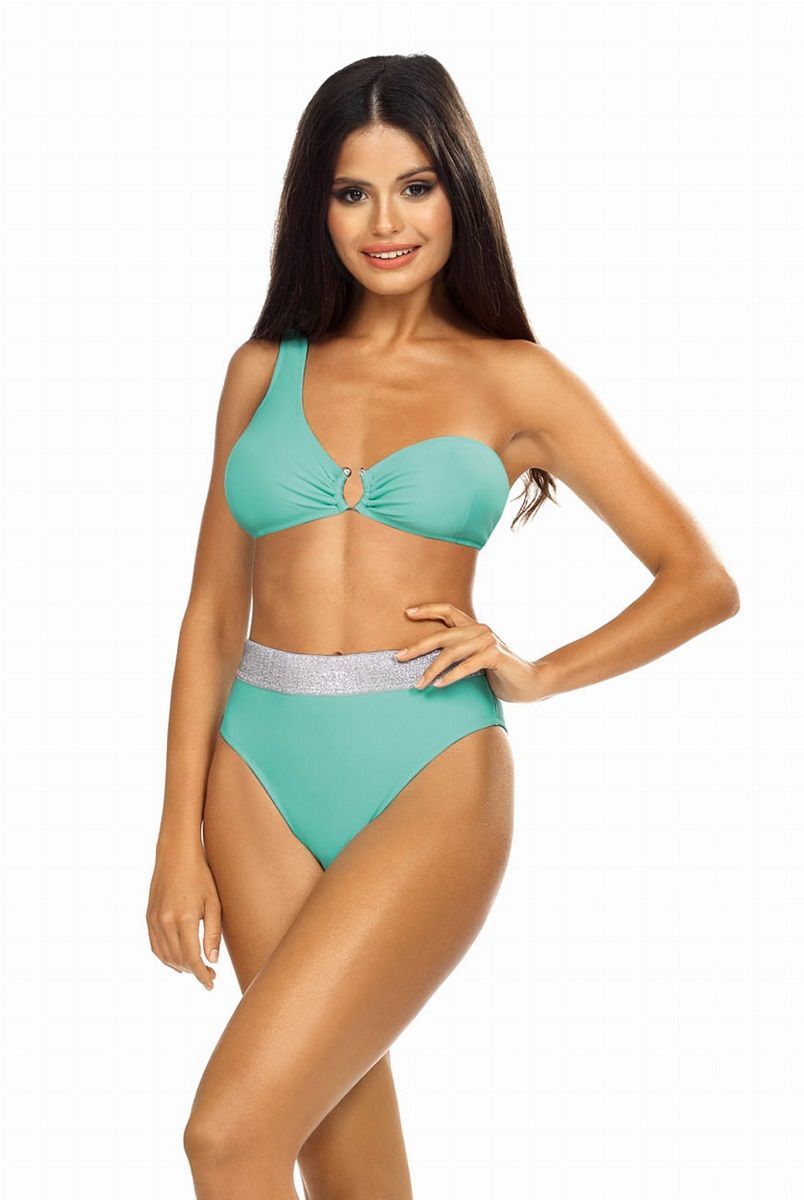 Купальник раздельный, бюстгальтер топ с широкой бретелью на одно плечо, между чашек металлическое украшение с кристаллами. Трусики слип на стрейч-подкладке с посадкой выше среднего, с широкой эластичной резинкой с серебряным люрексом. В комплекте: лиф, трусики. Внимание: европейские размеры! См. размерную сетку производителя.