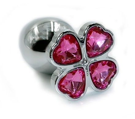 Анальная пробка из алюминия размер S. Страз в форме четырёхлистного клевера выполнен из стекла розового цвета. Упакована вельветовый мешочек для хранения. Вес - 52 гр.