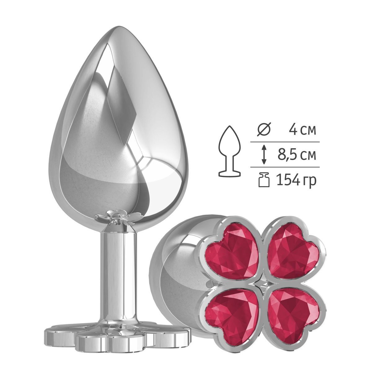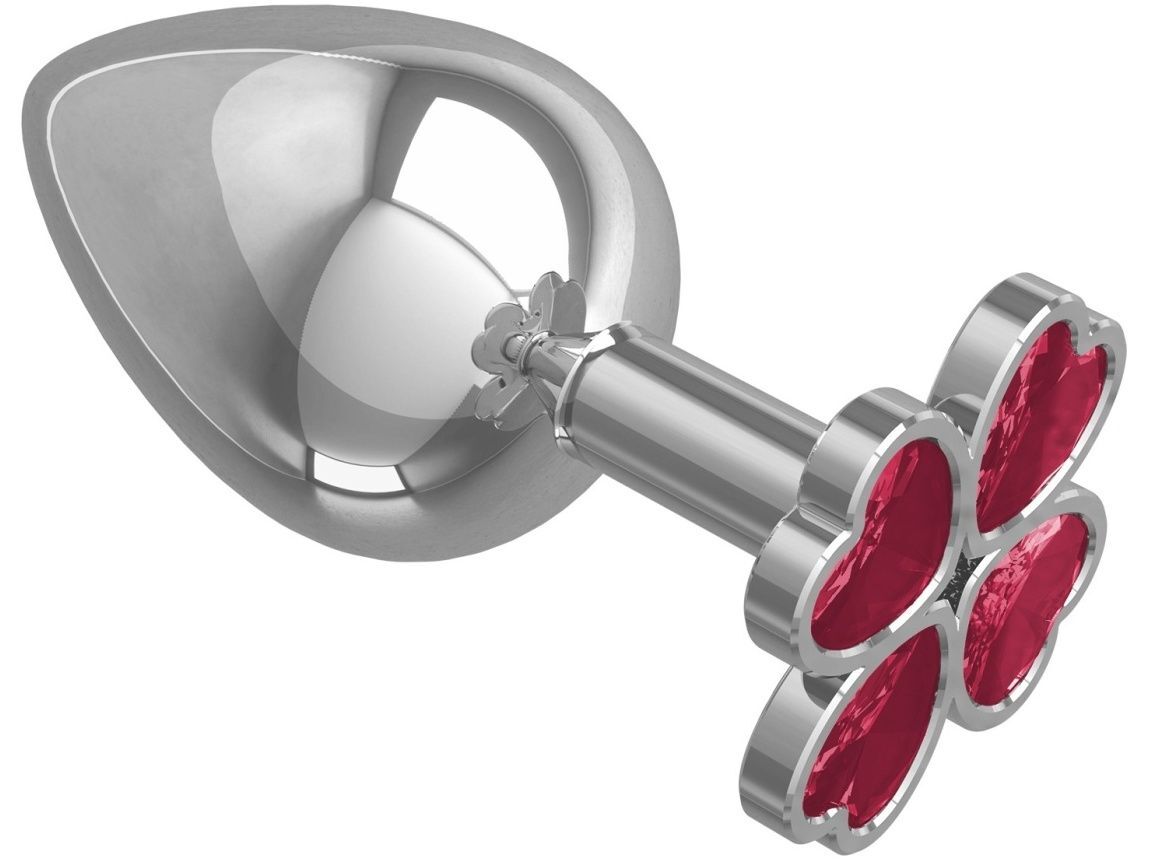 Серебристая анальная пробка-клевер с малиновым кристаллом - 9,5 см.