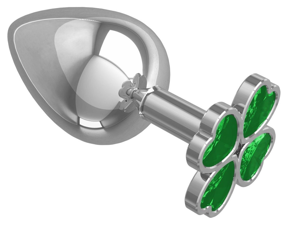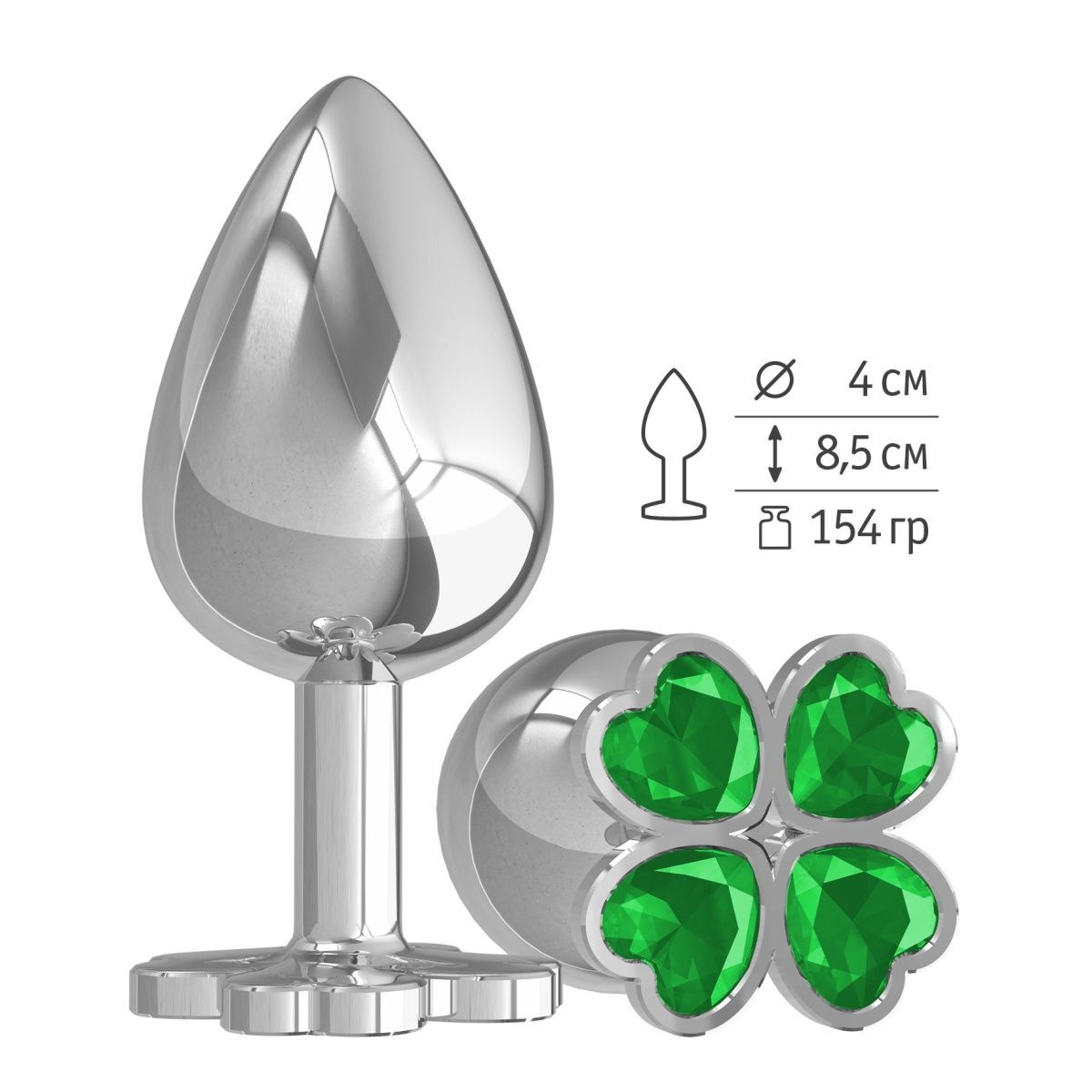 Серебристая анальная пробка-клевер с зеленым кристаллом - 9,5 см.