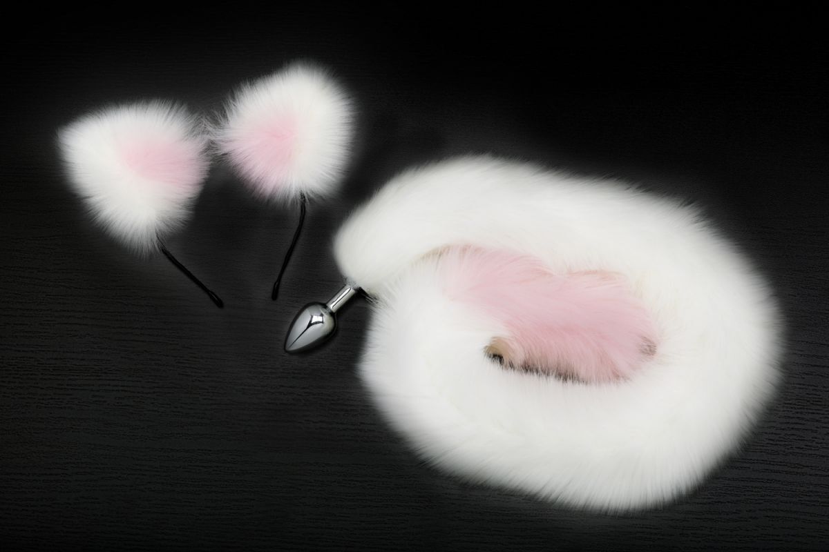 Серебристая анальная пробка с бело-розовым хвостиком и ободком-ушками