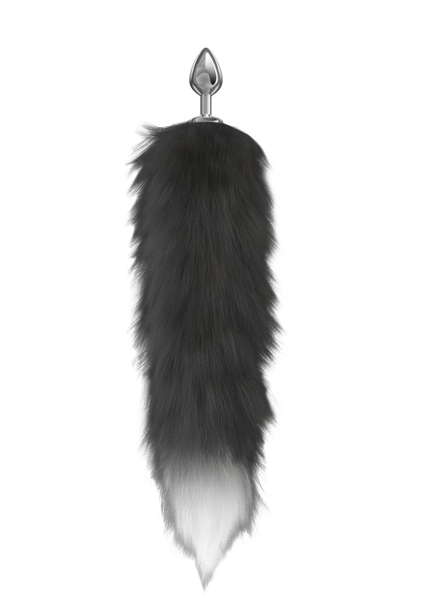 Серебристая анальная пробка с черным хвостом Galaxy