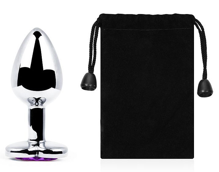 Серебристая анальная пробка с фиолетовым кристаллом-сердечком - 8 см.