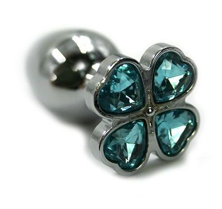 Анальная пробка из алюминия размер S. Страз в форме четырёхлистного клевера выполнен из стекла голубого цвета. Упакована вельветовый мешочек для хранения. Вес - 52 гр.