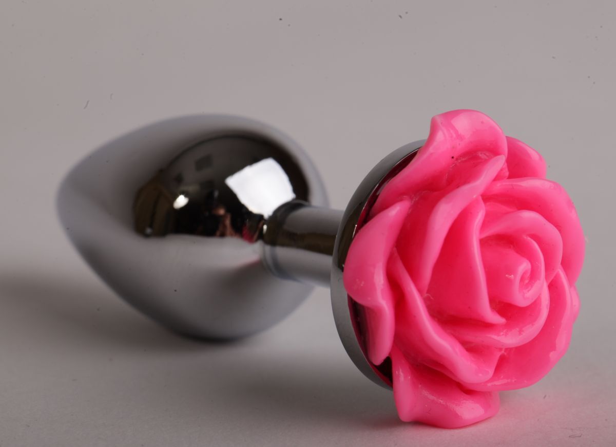 Серебристая анальная пробка с розовой розочкой - 8 см.