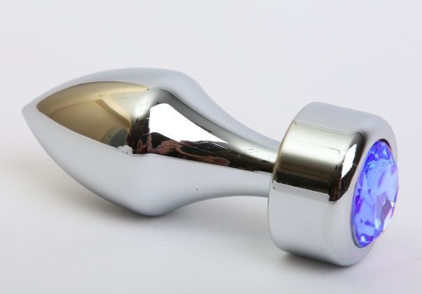 Серебристая анальная пробка с широким основанием и синим кристаллом - 7,8 см.
