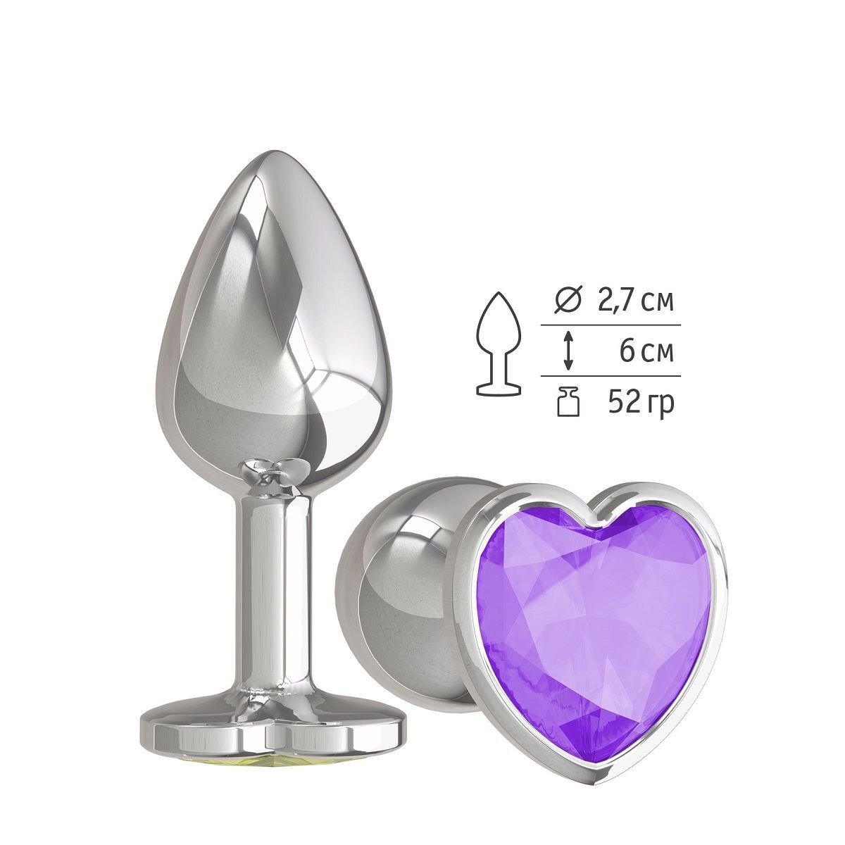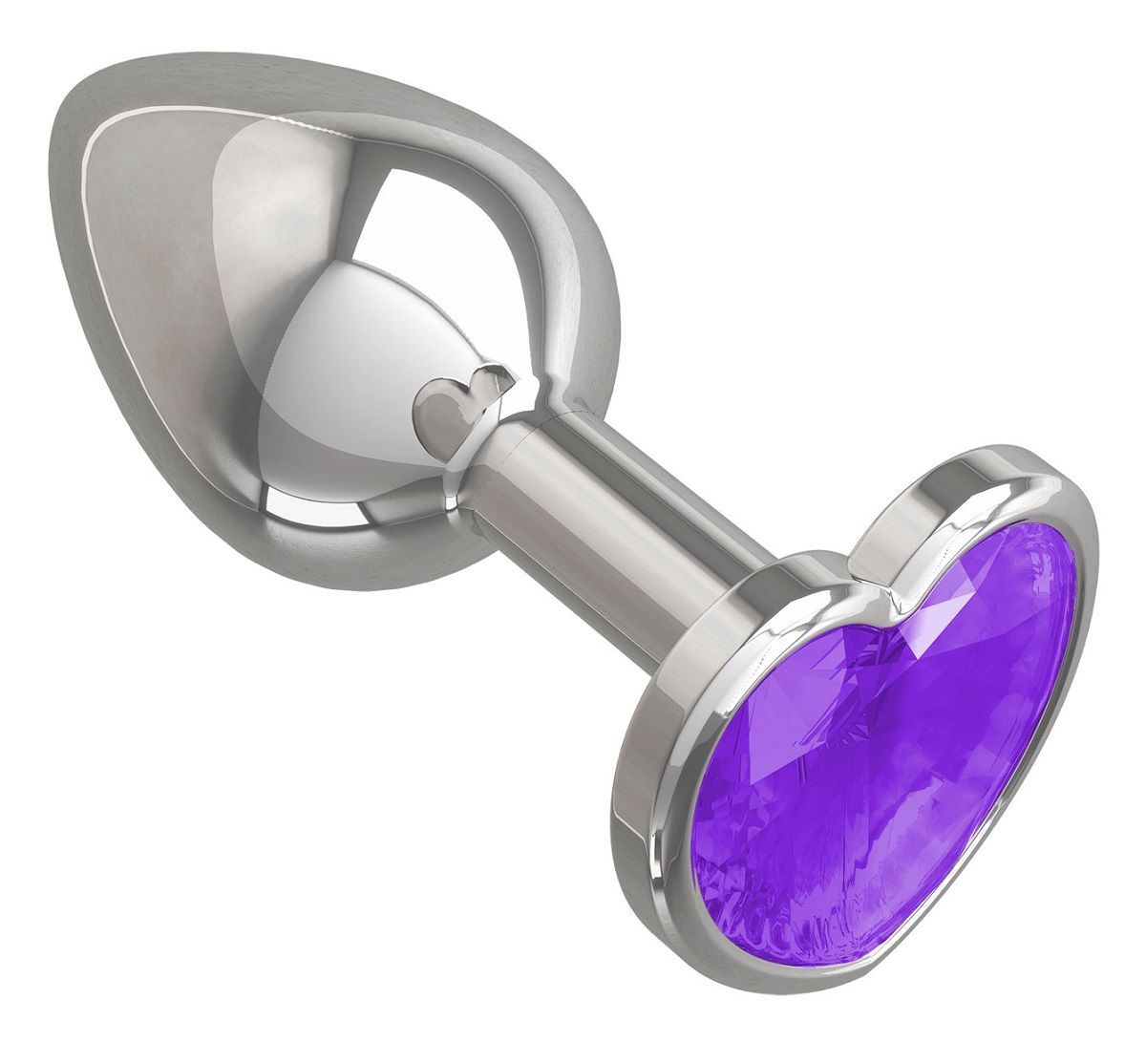 Серебристая анальная втулка с фиолетовым кристаллом-сердцем - 7 см.