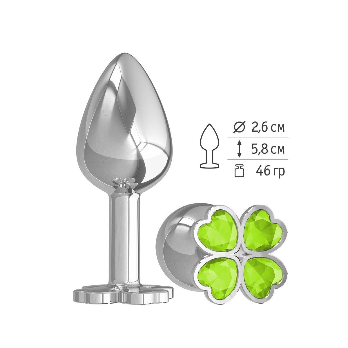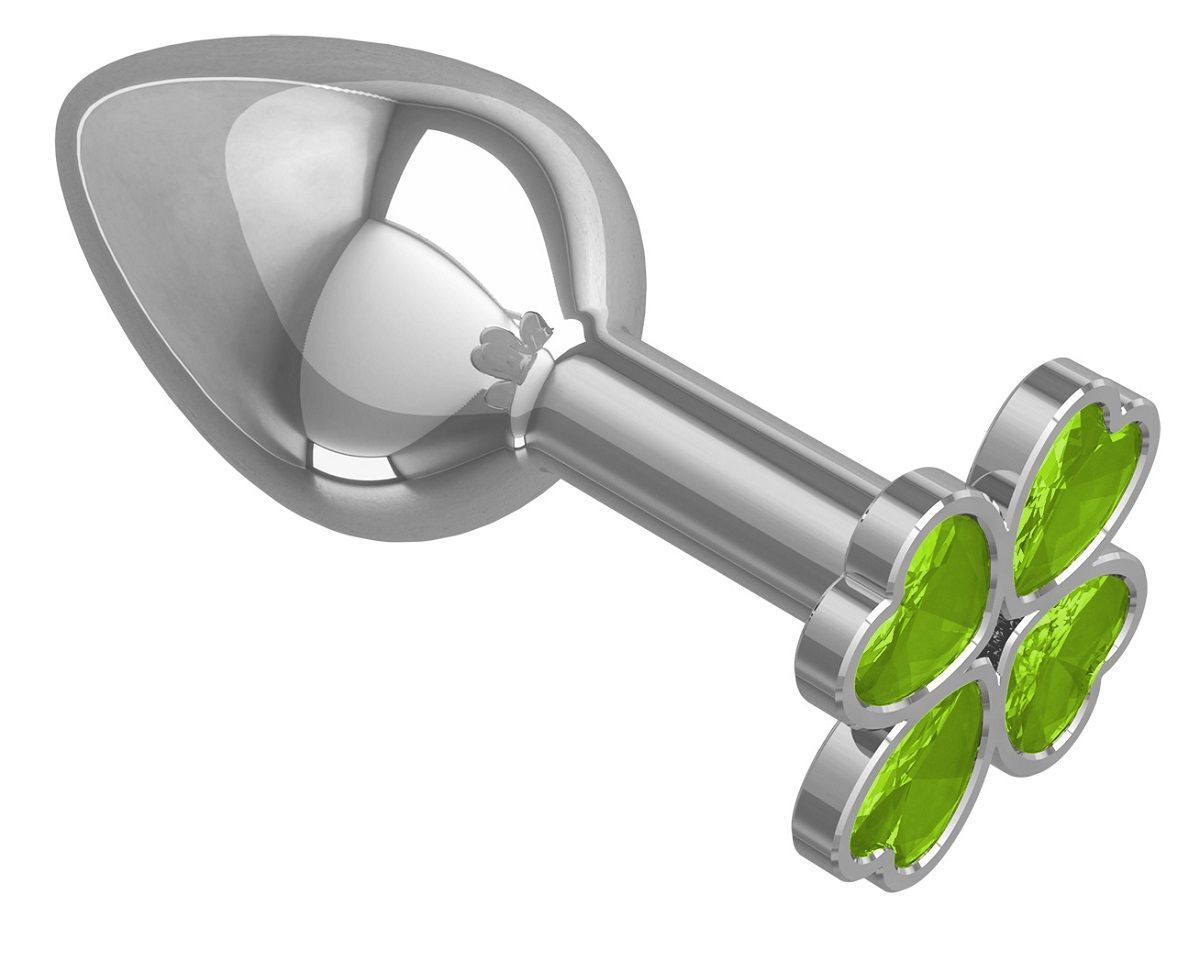 Серебристая анальная втулка с клевером из лаймовых кристаллов - 7 см.