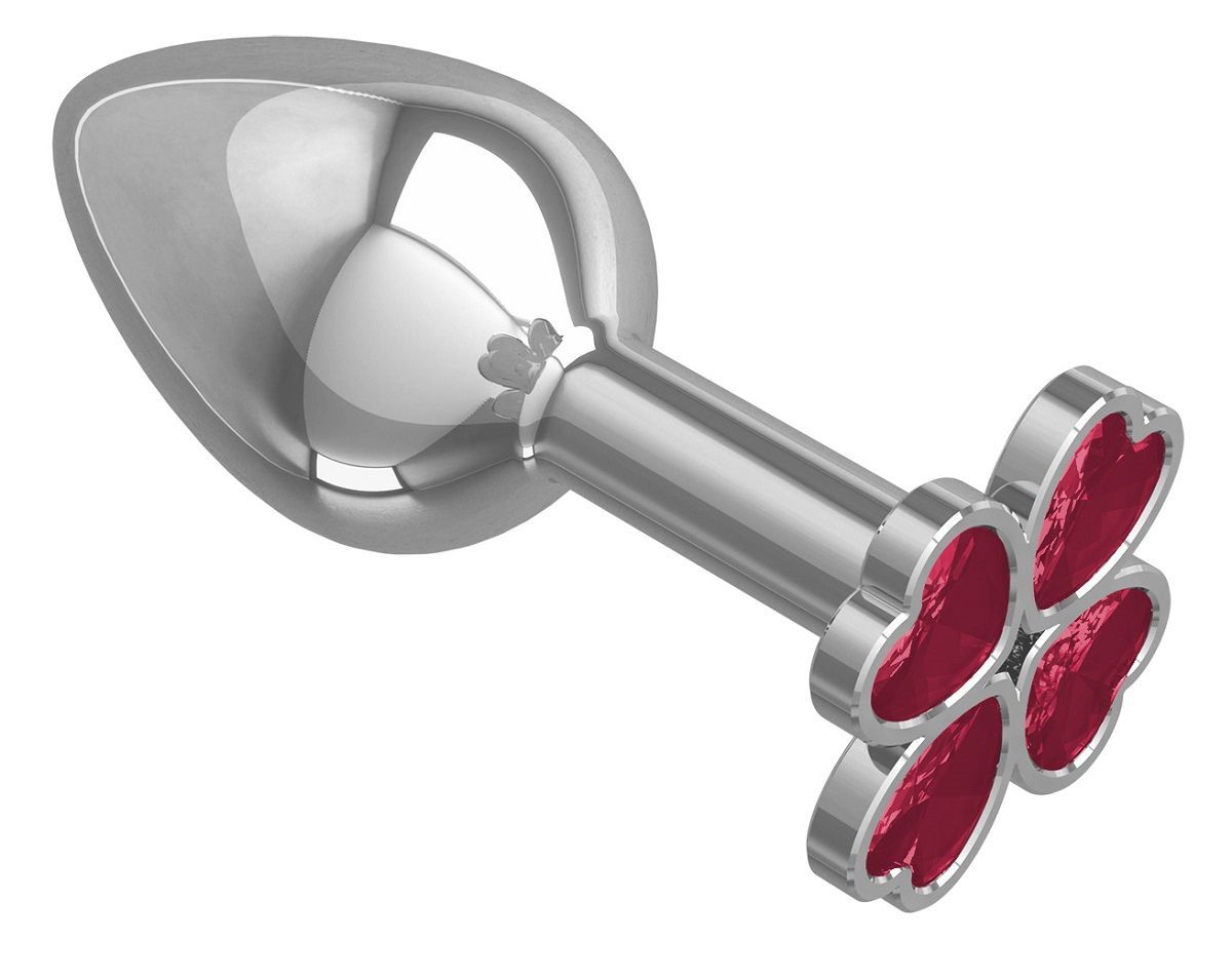 Серебристая анальная втулка с клевером из малиновых кристаллов - 7 см.