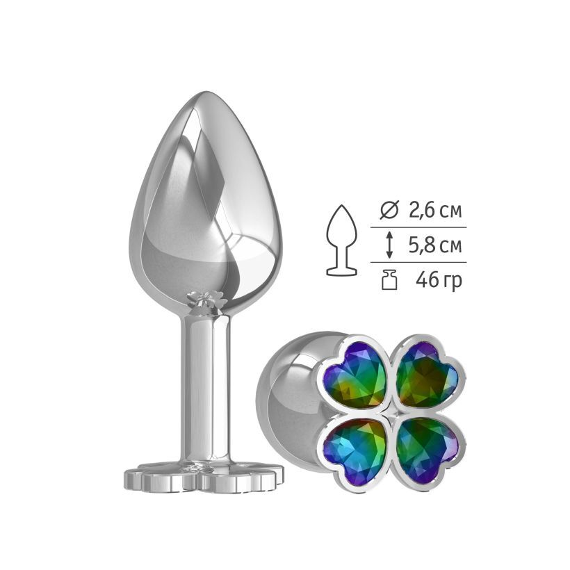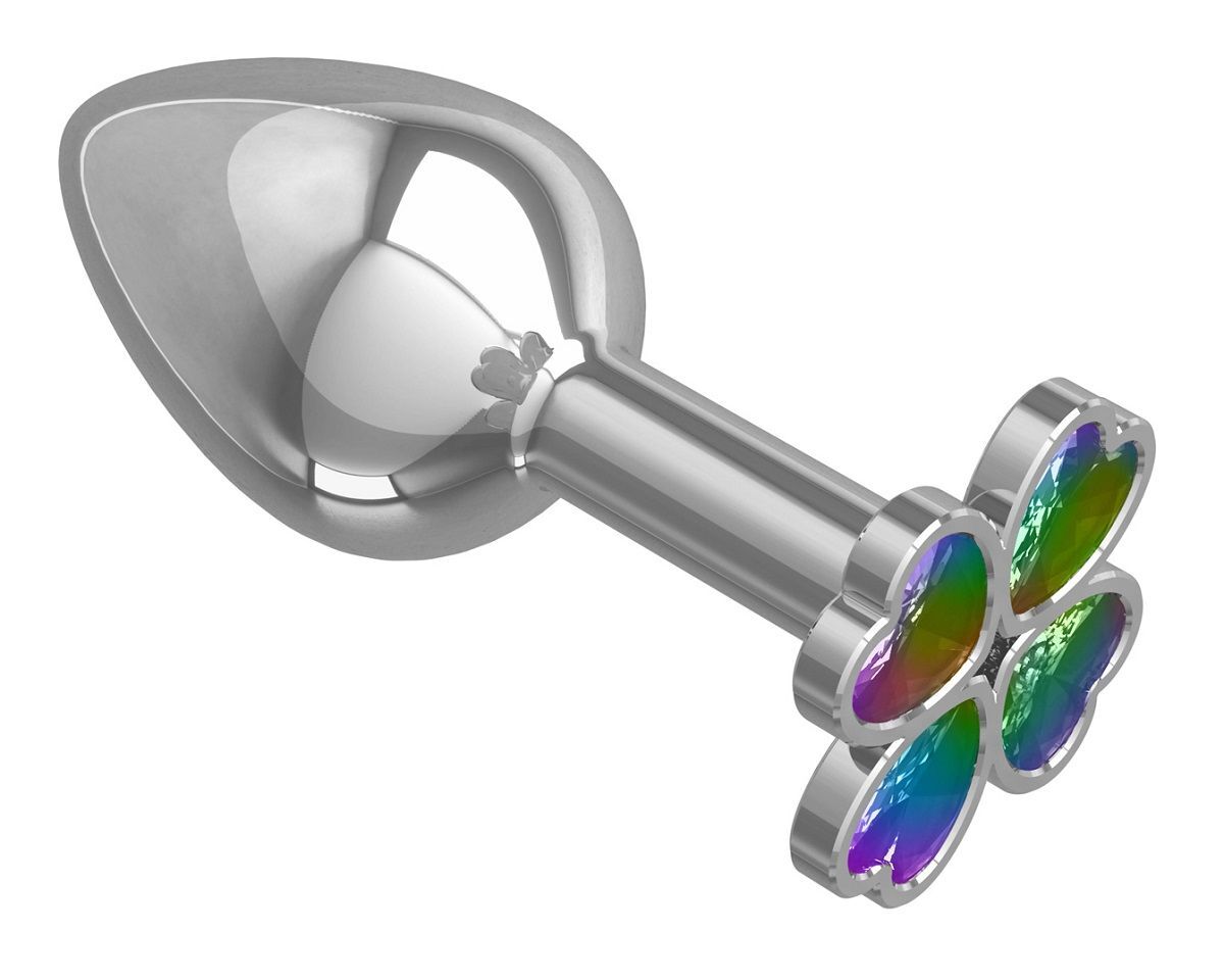 Серебристая анальная втулка с клевером из радужных кристаллов - 7 см.