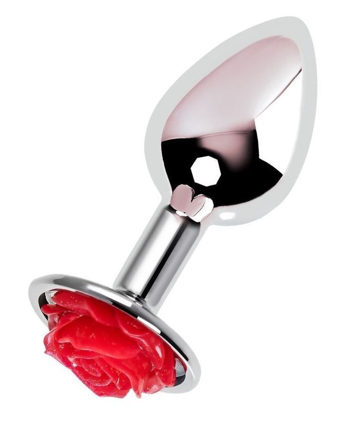 Серебристая анальная втулка с красной розочкой - 8 см.