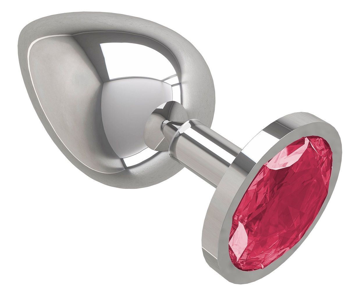 Серебристая большая анальная пробка с малиновым кристаллом - 9,5 см.
