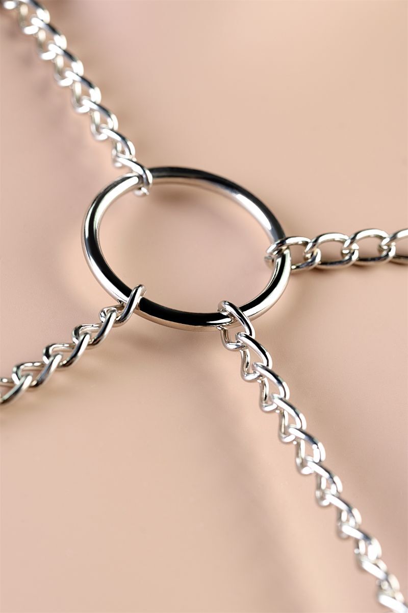 Ошеломительное бикини для дерзких и красивых! Трусики-стринги фантазийной формы украшены сверкающими цепочками, эффектное бра открывает бюст. Металл холодит кожу, возбуждая желание сделать ночь горячее. Самые смелые и независимые могут надеть бра поверх одежды и покорить весь мир! Регулируемые застежки позволяют подогнать этот комплект под любой размер.