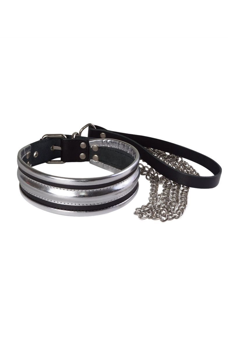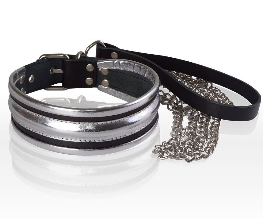 Сверкающий ошейник из натуральной высококачественной кожи, который сделает образ сабмиссива ярким, вычурным. Сочетание натуральной черной кожи с серебристой декоративной отделкой вызывает ощущение роскоши и дерзкой сексуальности. Ошейник можно использовать, как с поводком, для управления сабмиссива, так и без него, в качестве фетишного аксессуара. Цепочка серебристого цвета крепится к полукольцу на ошейнике при помощи карабина. Для удобного использования на конце цепочки имеется ремешок-петля. Регулировка размера и фиксация ошейника производится при помощи пряжки ремешка. Длина цепочки - 80 см.