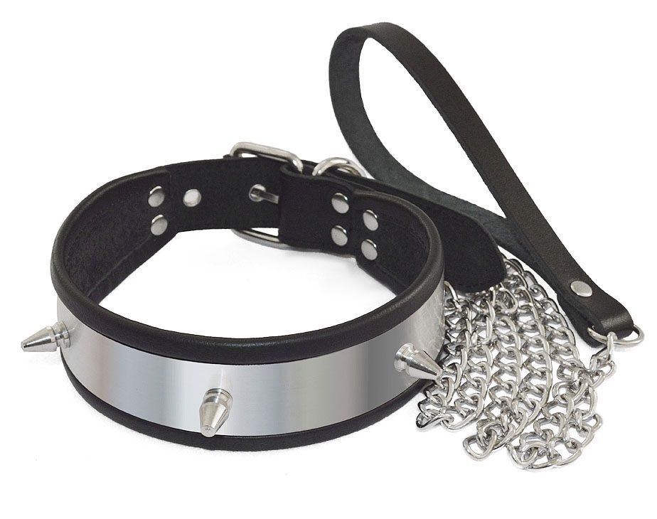 Ошейник изготовлен из высококачественной кожи черного цвета. По краю изделия проходит оторочка, обеспечивающая комфортное использование. Особенностью данной модели является вставка, имитирующая металл, которая придаёт изделию эффектности. Отрегулировать размер ошейника можно при помощи металлической пряжки. Вся металлическая фурнитура имеет никелевое покрытие. Ширина - 4 см. Длина поводка - 100 см.