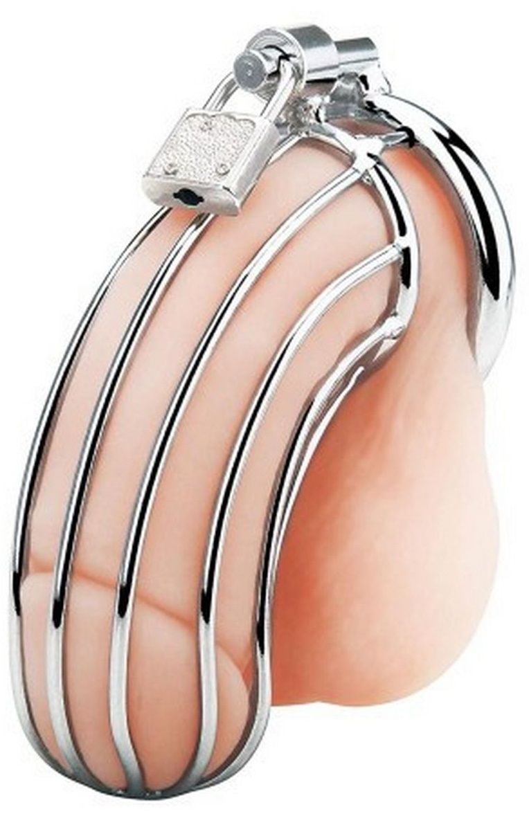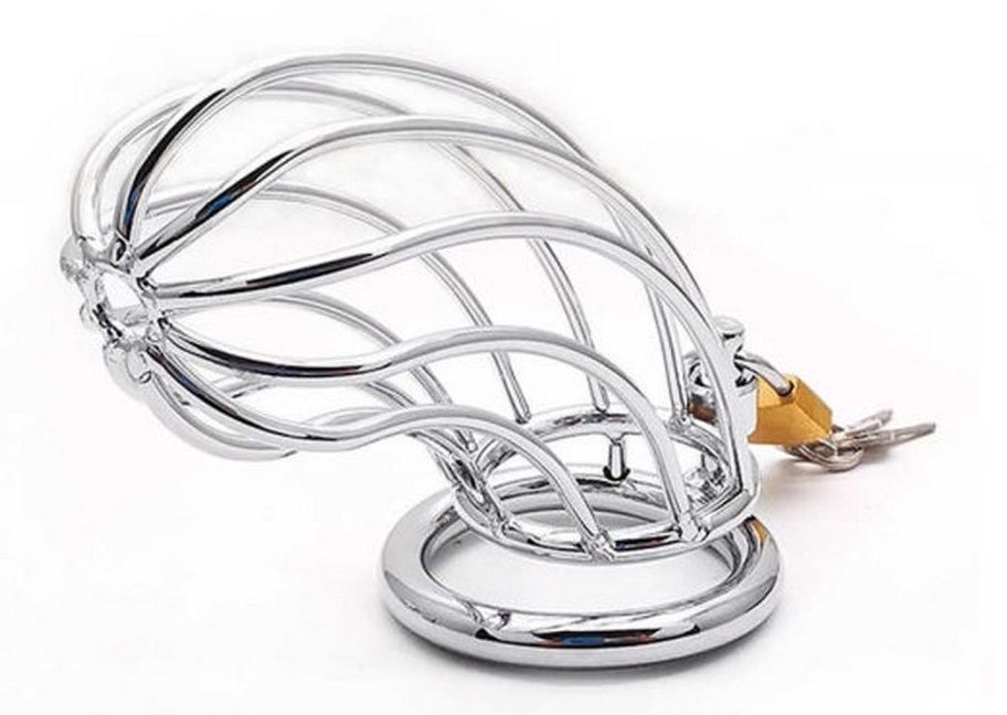Клетка для члена из стали. Шикарный в своем исполнении мужской пояс верности - клетка. Продолговатые решётки с эргономичным изгибом позволит не только играть с этим девайсом во время БДСМ-сессий, но и носить на постоянной основе. Надежное крепление замочком у основания не позволит вашему рабу снять его с себя, и вы сможете полностью контролировать половую жизнь своего партнера. Мужской пояс верности может стать отличным подарком для Вашего партнёра. Рабочая длина корпуса - 10 см. Длина корпуса по верхней дуге - 14 см., по нижней дуге - 7,5 см. Внутренний диаметр корпуса - 4 см.