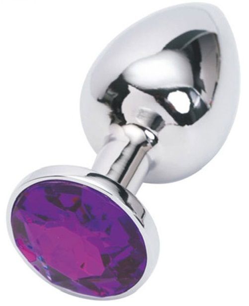 Серебряная металлическая анальная пробка с фиолетовым стразиком - 7,6 см.