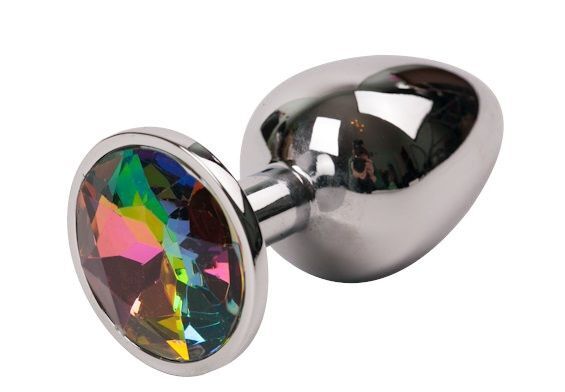 Серебряная металлическая анальная пробка с радужным стразиком - 7,6 см.