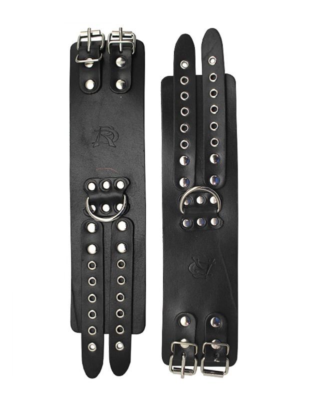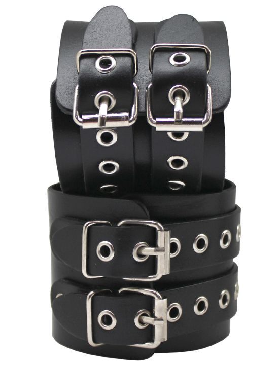 Широкие наручники, застегивающиеся на 2 пряжки. Изготовлены из натуральной кожи. Не подшиты. Размер регулируется. Прилагается карабин. Ручная работа. Ширина – 7 см.