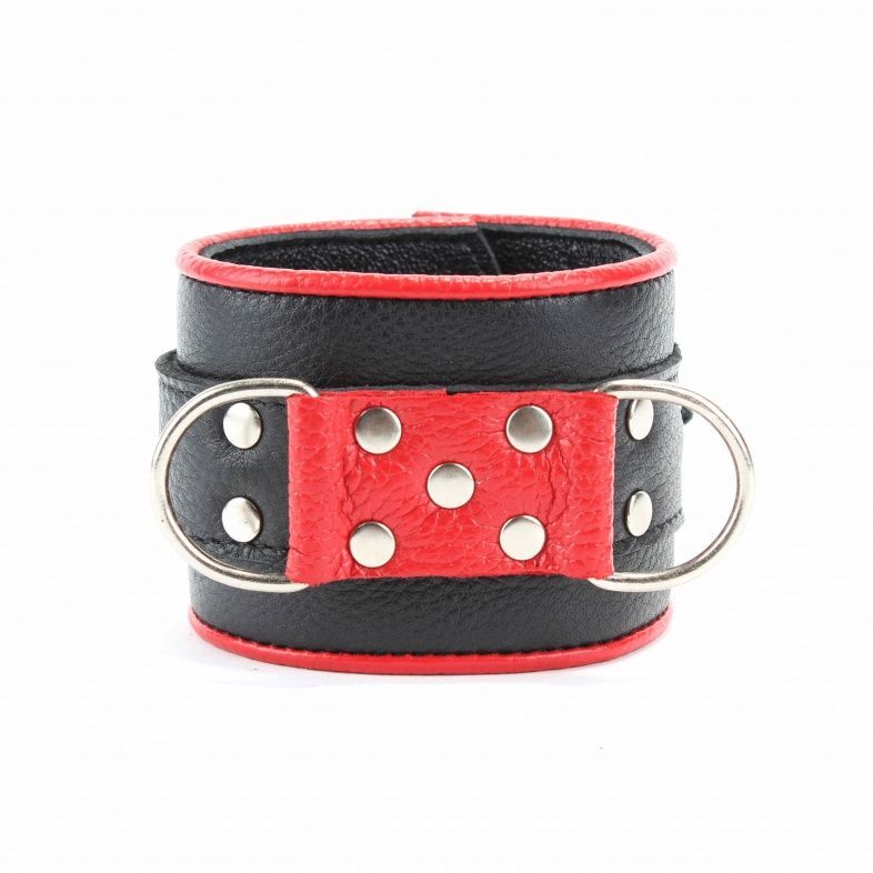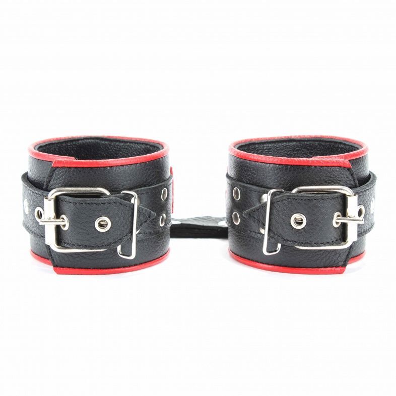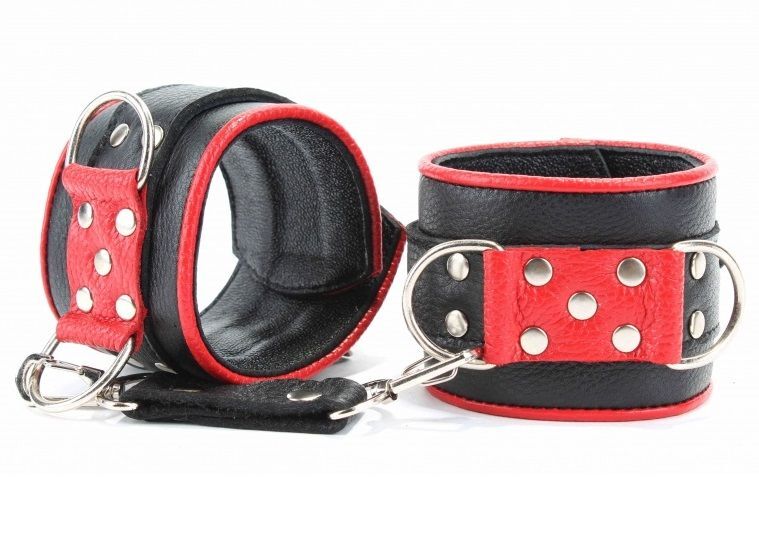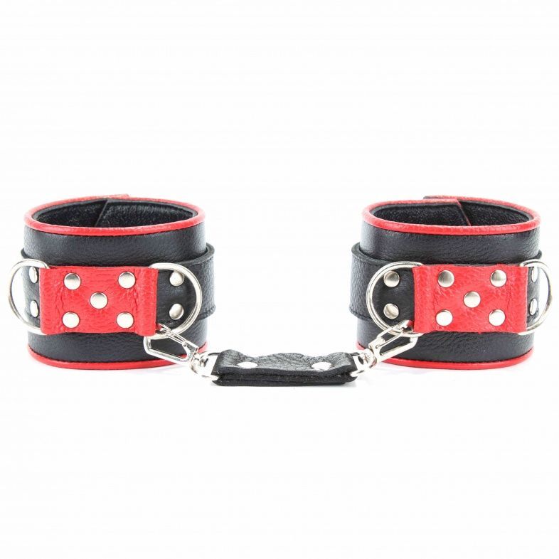 Наручники выполнены из черной натуральной кожи с красной окантовкой. Изделие декорировано металлическими заклёпками. Наручники надежно фиксируются пряжками и ремнями, позволяющими выбрать нужный размер, подойдут на обхват руки от 16 до 25 см. Кожаное соединение на карабинах фиксирует наручники вместе. На каждом аксессуаре два полукольца из сварной фурнитуры. Стильные наручники помогу воплотить эротические фантазии в реальность. Ширина - 6 см. Длина соединения - 14 см.