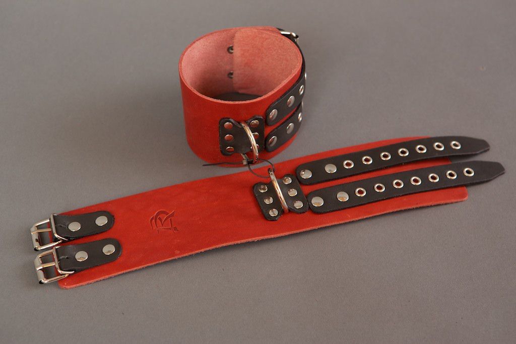 Широкие наручники ручной работы выполнены из комбинации натуральной кожи красного и черного цвета. Они не нарушают кровообращение и просты в применении. Специальная выделка обеспечивает жесткую фиксацию. Удобная ремневая регулировка размера и D-образные кольца делают эту модель удобной и функциональной. Ширина - 7 см.