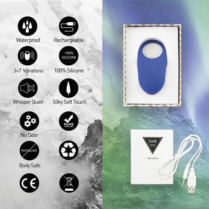 Водонепроницаемое вибрирующее кольцо для пениса синего цвета Thor от Feelztoys сделает мужскую эрекцию более продолжительной и сильной, за счет плотного обхвата полового член. Оно обладает сильными вибрациями и может использоваться как для одиночной игры, так и для пар. Для мужских соло-игр Вы можете носить эрекционное кольцо повернув его вибрирующим язычком вниз для стимуляции мошонки или во время парных игр - вверх, для стимуляции клитора женщины. Thor имеет 3 разные скорости и 7 разных паттернов вибрации, абсолютно не имеет запаха, с очень тихим мотором. Кольцо выполнено из шелковистого мягкого силикона и имеет идеальную форму, при полной зарядке оно проработает около двух часов.