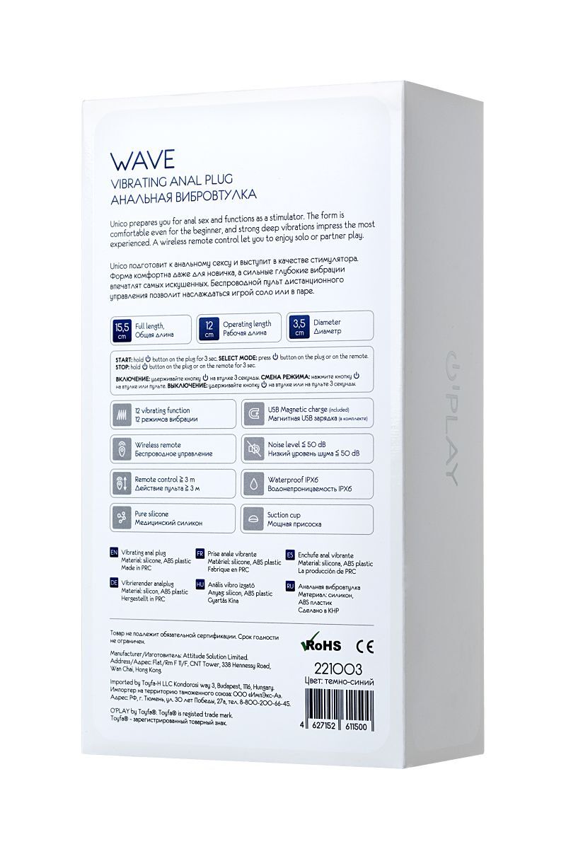 Wave подготовит к анальному сексу и выступит в качестве стимулятора. Форма комфортна даже для новичка. Волнообразная форма и сильные глубокие вибрации впечатлят самых искушенных. Беспроводной пульт дистанционного управления позволит наслаждаться игрой соло или в паре. 12 режимов вибрации. Беспроводное дистанционное управление на расстоянии до 3 метров. Медицинский силикон. Магнитная USB зарядка (в комплекте). Низкий уровень шума (не более 50 dB). Водонепроницаемость IPX6. Мощная присоска. Рабочая длина - 12 см. Минимальный диаметр - 1,8 см. Пульт работает от 1 батарейки типа CR2032.