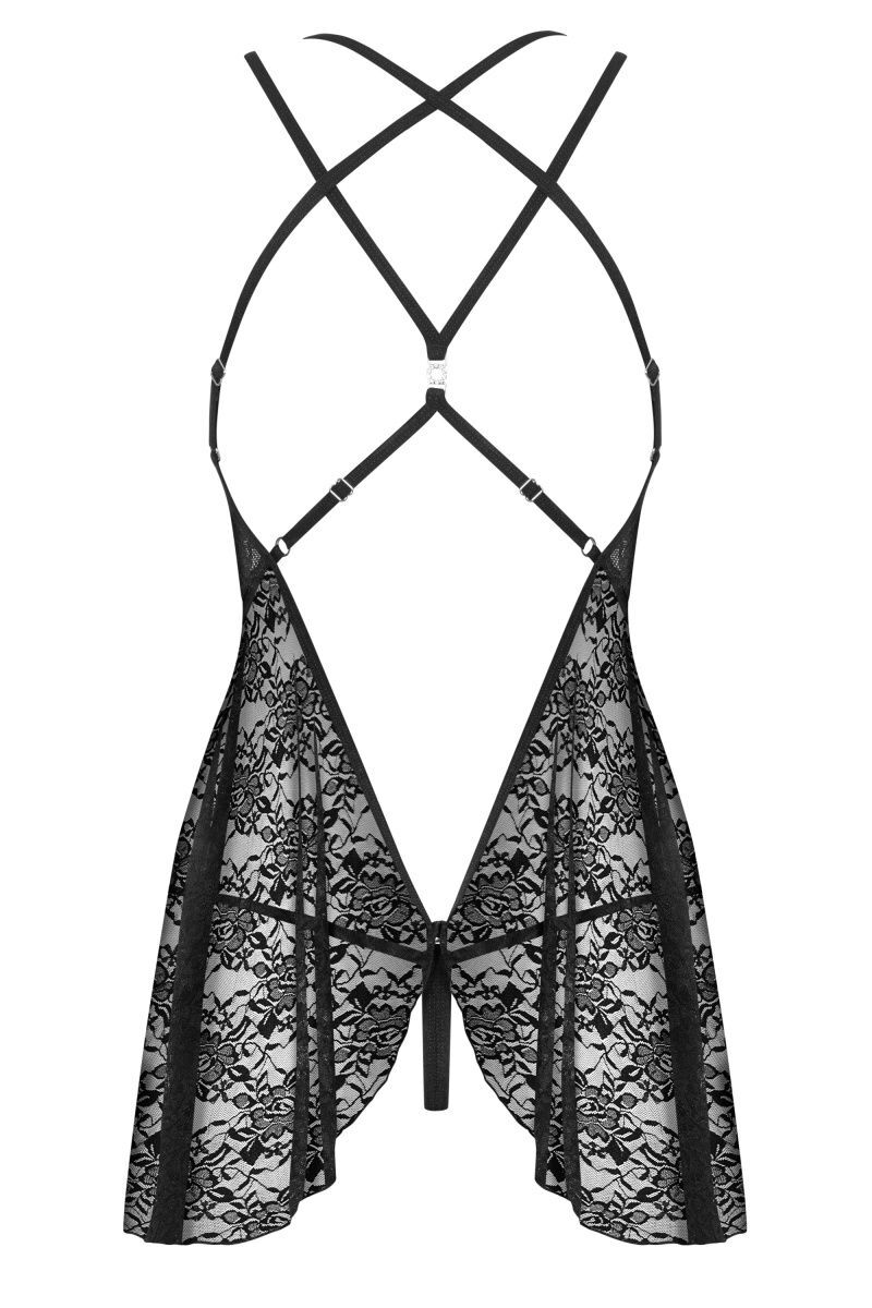 Соблазнительная сорочка из кружева с цветочным мотивом. Мягкие чашечки на косточках украшены сверкающим украшением. Эластичные ремешки над грудью соединяются с бретелями при помощи колец. Сзади регулируемые бретели эффектно переплетаются между собой, обнажая спину. Расклешенный подол сорочки с игривым вырезом на ягодицах выглядит очень пикантно. В комплекте: сорочка, трусики-стринги.