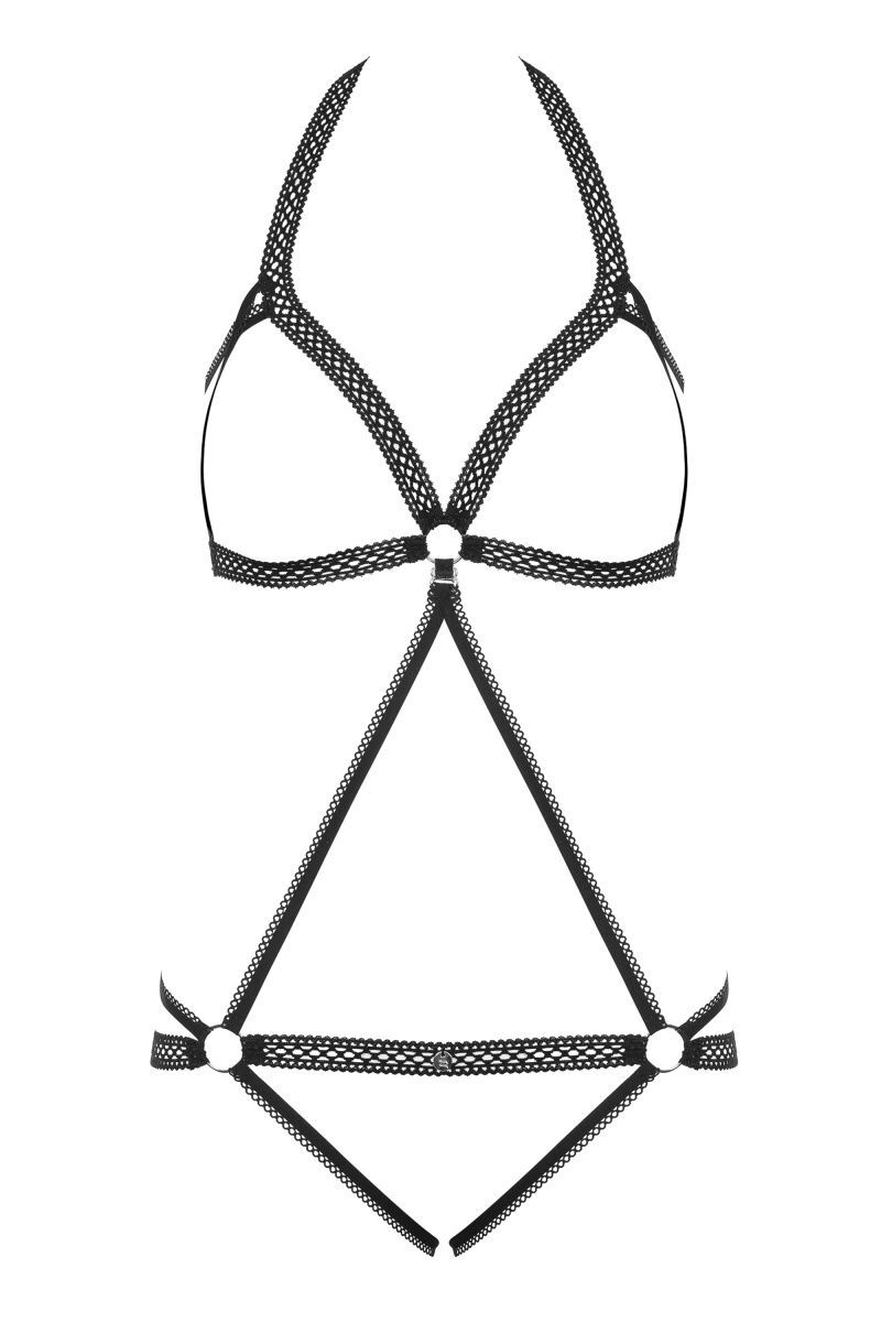 Это эластичное боди, состоящее из ажурных эластичных лент и металлических колец, покорит вас с первого взгляда. Оно, будто начерченный художником контур, подчеркнёт все изгибы вашей фигурки и пышные достоинства. Верхняя часть боди соединяется с нижней лишь двумя тесемками, образующими треугольник. Интимный доступ позволит не снимать наряд для занятий любовью.
