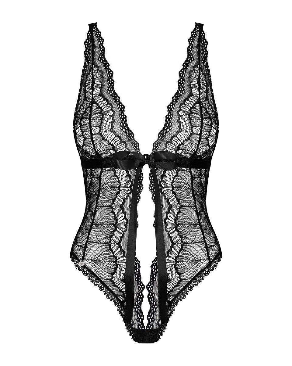 Пикантное боди-стринг из коллекции Isabellia создано из широких кружевных полос с очень глубоким декольте. Под бюстом застежка и бант из атласных лент. Тонкие бретельки регулируются по длине.