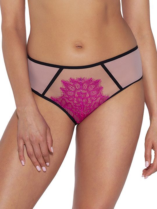 Трусики-бразилиана выполнены спереди из сетки телесного цвета, декорированы ярко-розовым кружевом с ресничками, спинка из эластичного трикотажа, резинки контрастного черного цвета. Ластовица из 100% хлопка телесного цвета.