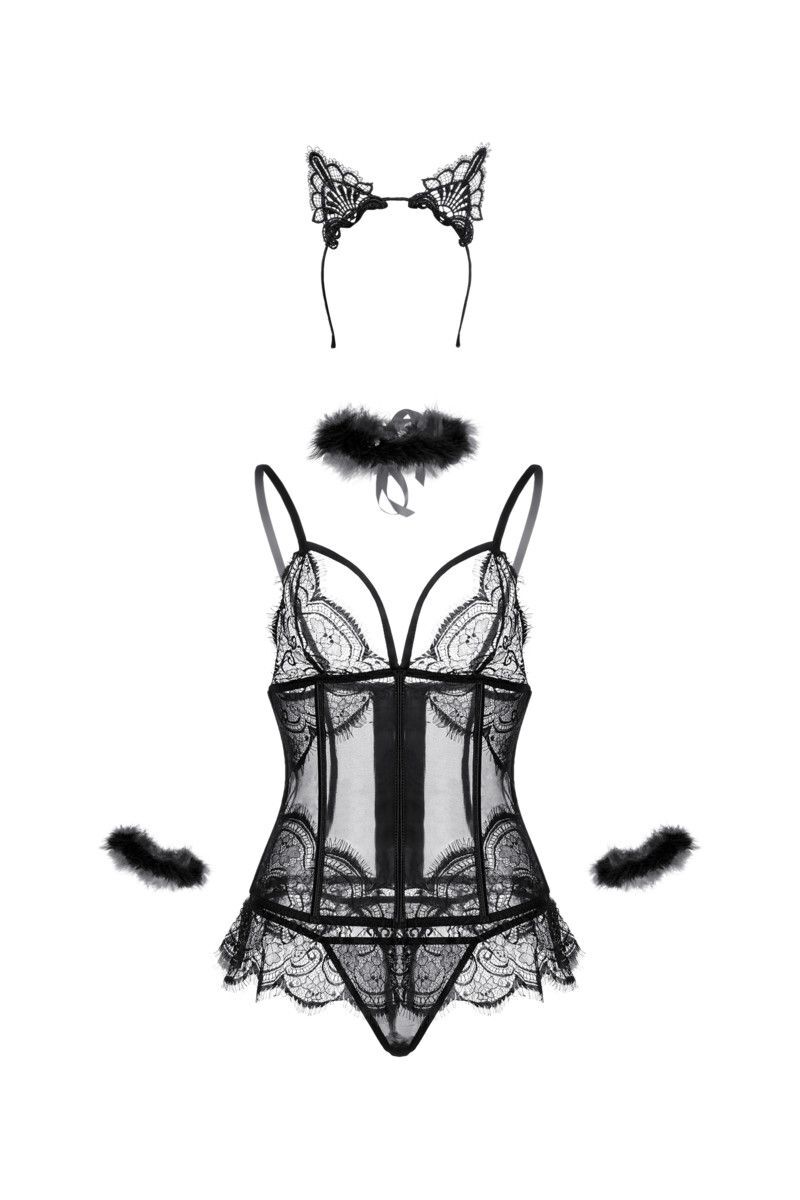 Прозрачный корсет Kati от Сandy Girl с продольными косточками декорирован изящным кружевом. Глубокое декольте дополнено тонкими стрепами. Регулируемые бретели. Трехрядная застежка сзади. Металлический ободок с кружевными ушками, стринги из эластичной сетки, чокер и браслеты из пуха дополняют страстный образ. В комплекте: корсаж, трусики-стринги, чокер, ободок-ушки и наручники.