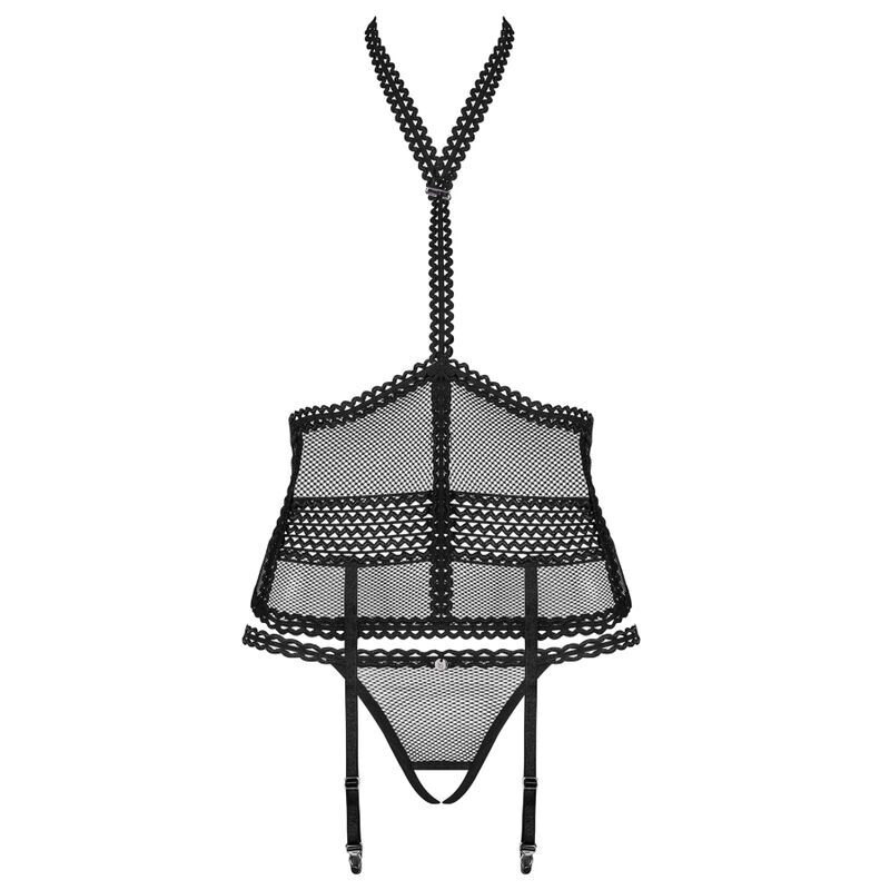 Корсаж Strapelie выполнен из сетки, на спине застежка-удлинитель, спереди крепится бретель в виде петли из широкой резинки, с застежкой. Пажи для чулок регулируются по длине. В комплекте трусики-стринги из тонких союзок, с открытой ластовицей. В комплекте: корсаж, трусики.