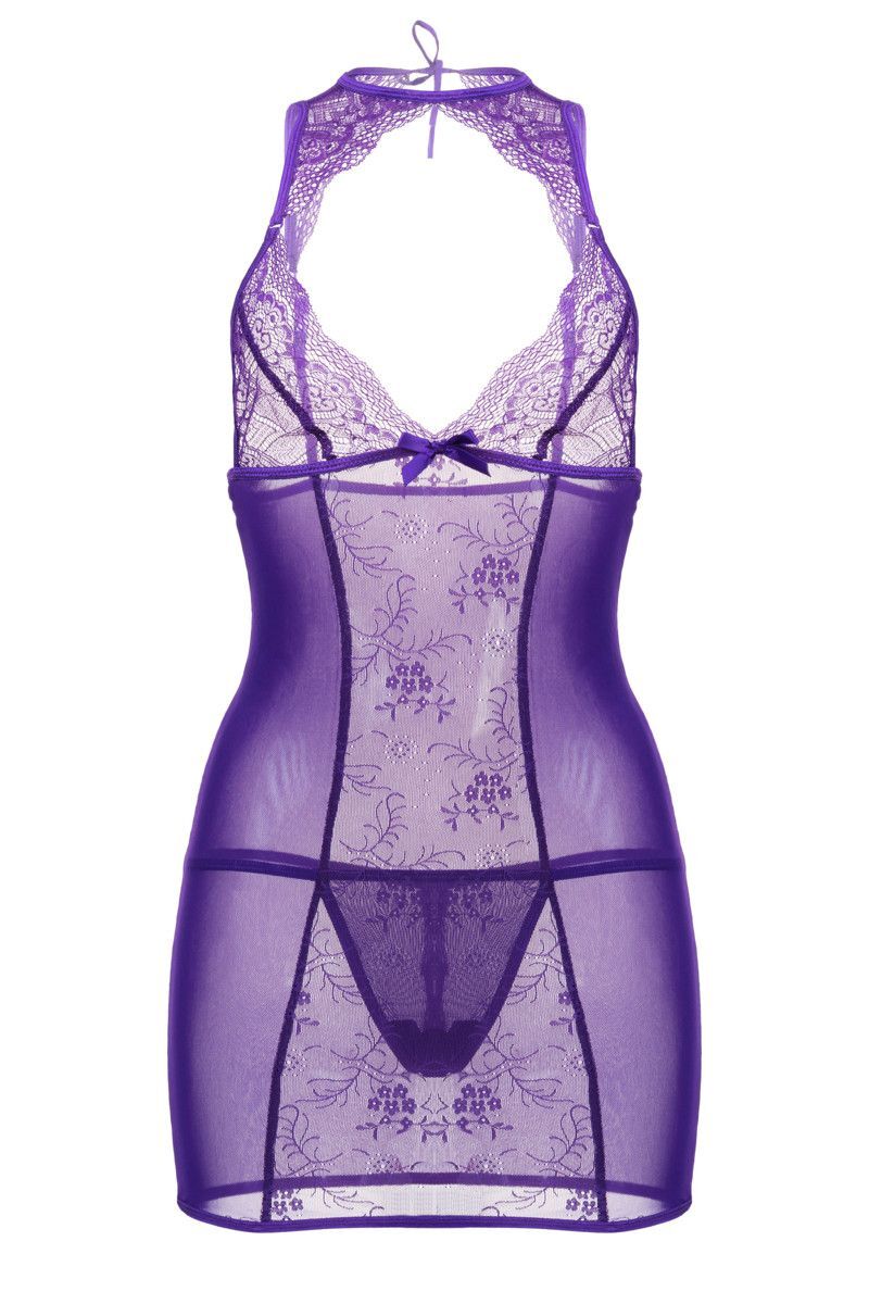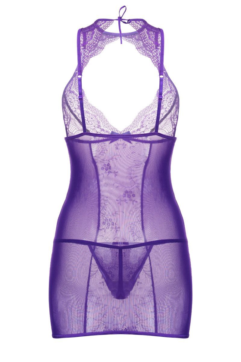 Комбинация из эластичной сетки с кружевной вставкой и фигурным декольте, украшенным сатиновым бантиком. Регулируемые бретели. Завязки на шее. Т-стринги в комплекте. В комплекте: сорочка, трусики-стринги.