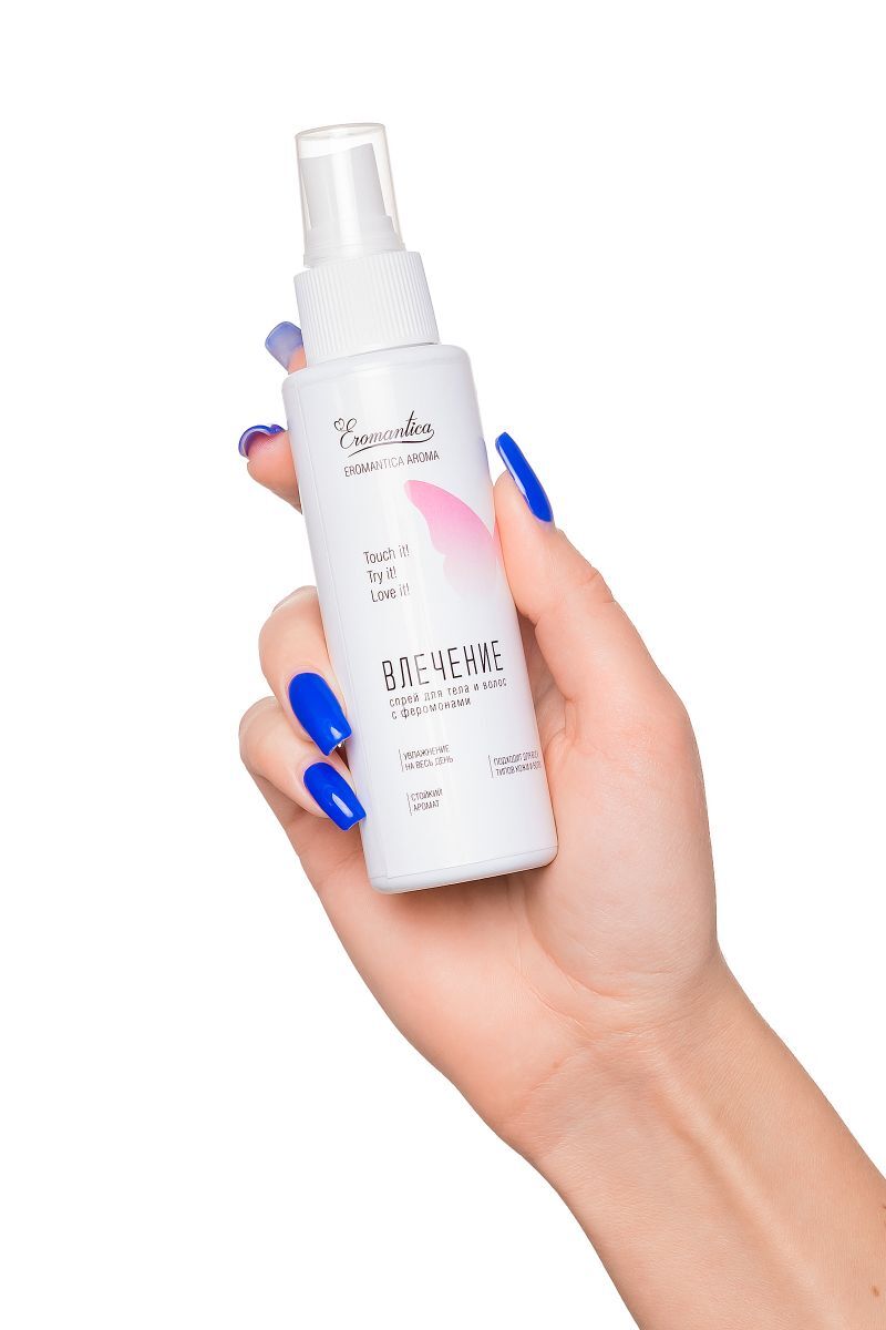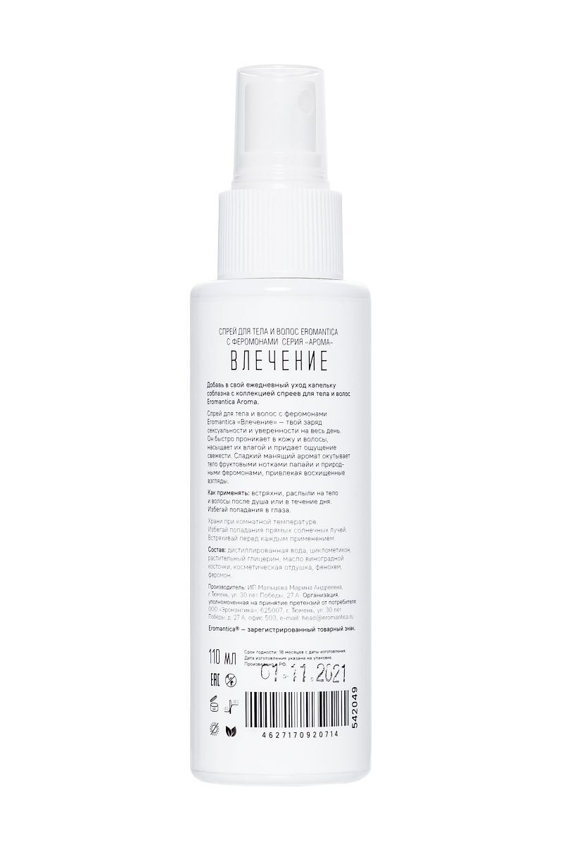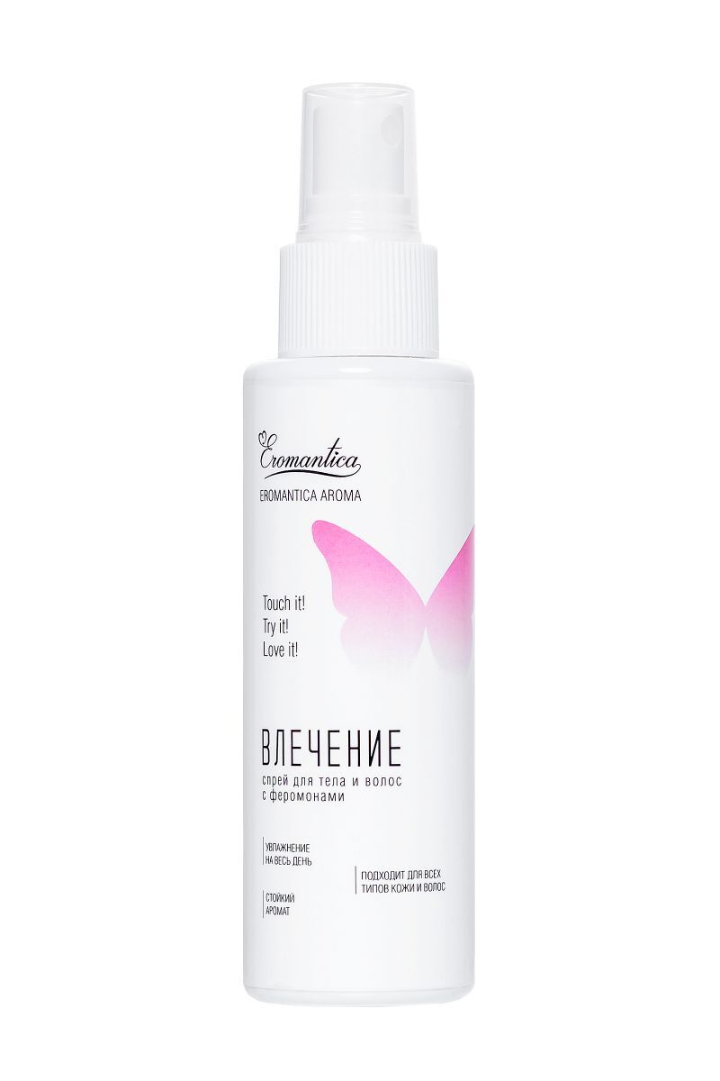 Добавь в свой ежедневный уход капельку соблазна с коллекцией спреев для тела и волос Eromantica Aroma. Спрей для тела и волос с феромонами Eromantica «Влечение» — твой заряд сексуальности и уверенности на весь день. Он быстро проникает в кожу и волосы, насыщает их влагой и придает ощущение свежести. Сладкий манящий аромат окутывает тело фруктовыми нотками папайи и природными феромонами, привлекая восхищенные взгляды. Как применять: встряхни, распыли на тело и волосы после душа или в течение дня. Избегай попадания в глаза. Храни при комнатной температуре вдали от прямых солнечных лучей. Встряхивай перед каждым применением.