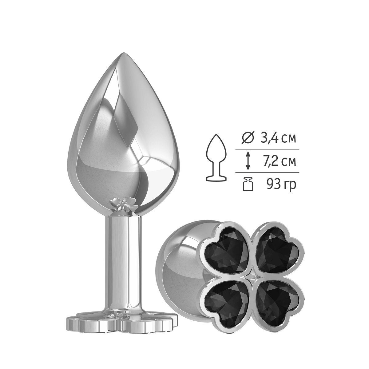 Средняя серебристая анальная втулка с клевером из черных кристаллов - 8,5 см.