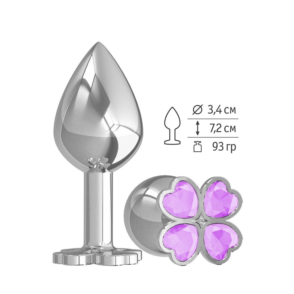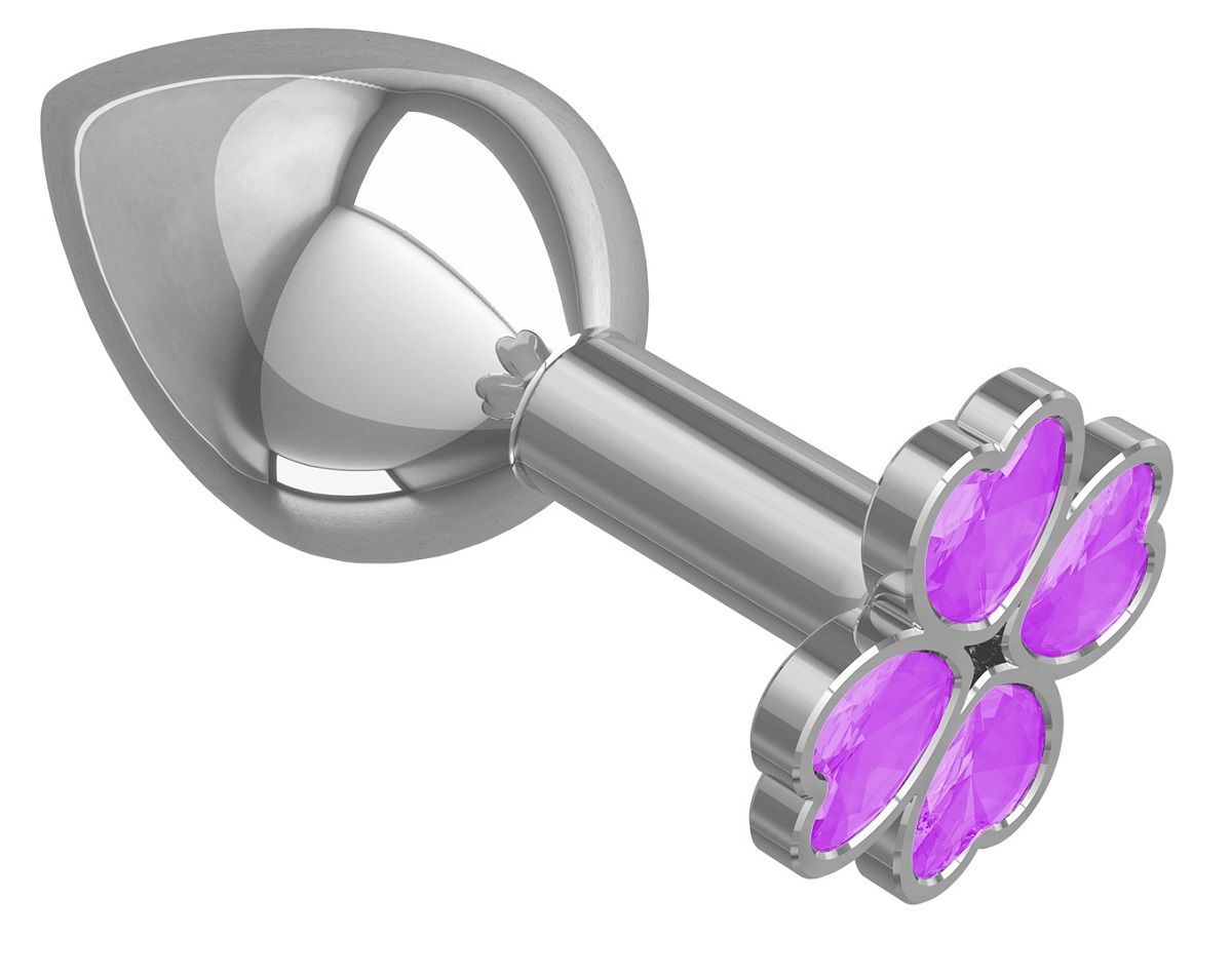 Средняя серебристая анальная втулка с клевером из сиреневых кристаллов - 8,5 см.