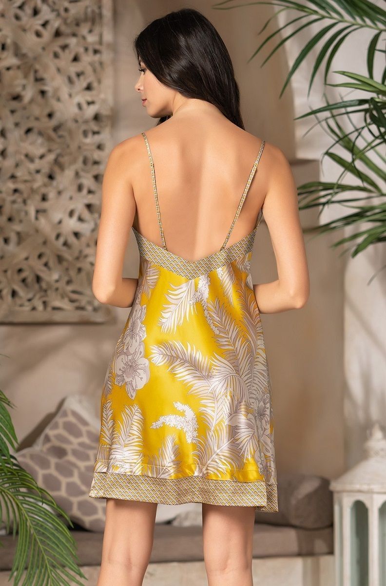 Короткая сорочка без подреза на тонких бретелях выполнена из лимонного принтованного растительным узором искусственного шелка. Лиф и низ сорочки украшены отделкой с мелкоузорчатым геометрическим паттерном.