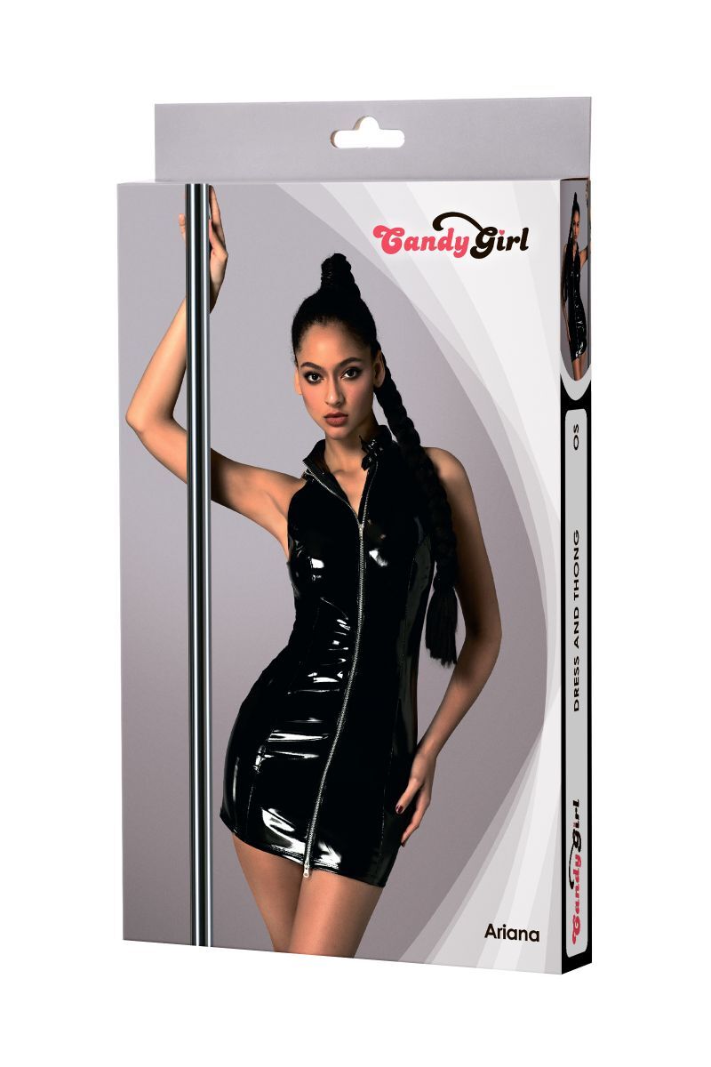 Облегающее лаковое платье Ariana от Candy Girl с воротником-стойкой привлекает внимание к каждому движению даже в полумраке. Двухсторонняя металлическая молния не только зрительно вытягивает силуэт, но и позволяет избавиться от платья в считанные мгновения. Подходящие стринги идеально дополняют комплект. В комплекте: платье, трусики-стринги.