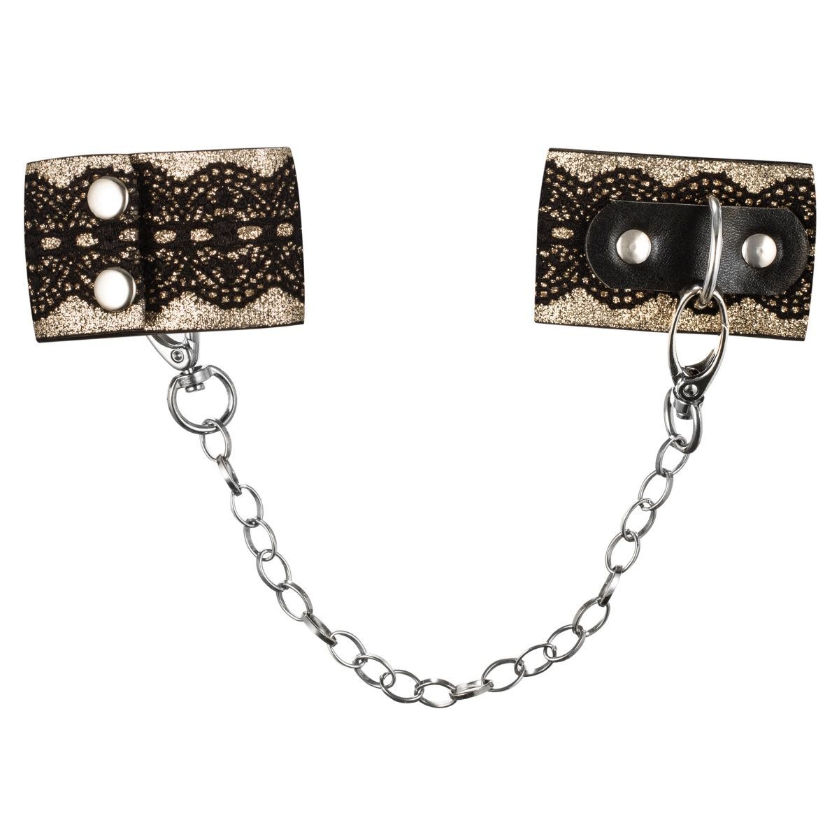 Стильные наручники переливающегося цвета с кружевом. Имеют съемную цепочку на карабинах. Застегиваются на две металлические кнопки.