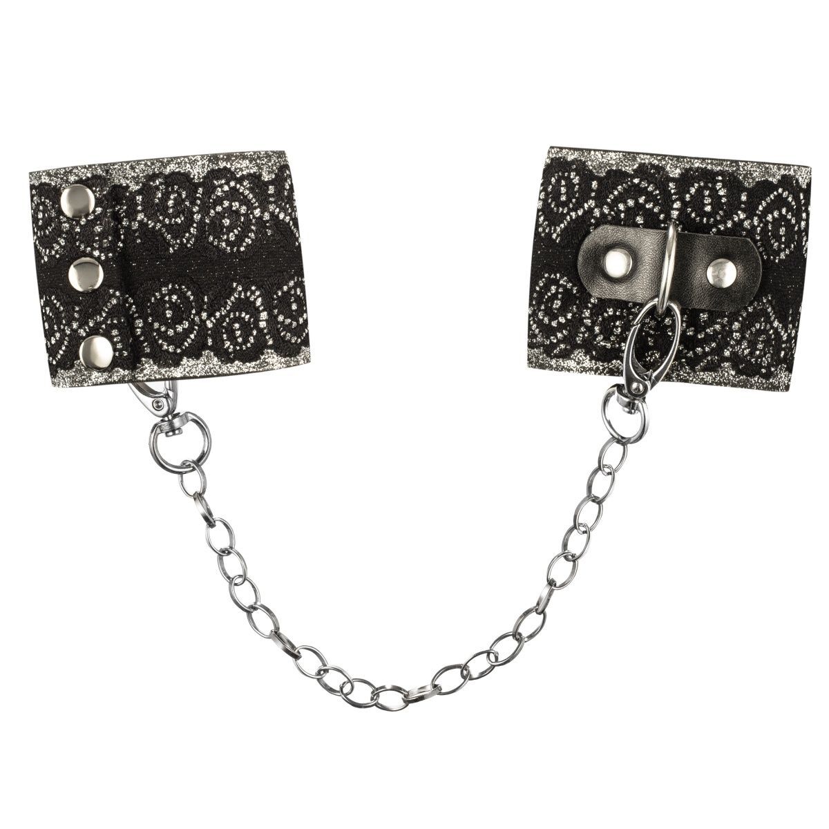 Широкие наручники мерцающего цвета. Украшены кружевом. Имеют съемную цепочку на карабинах. Застегиваются на три металлические кнопки.